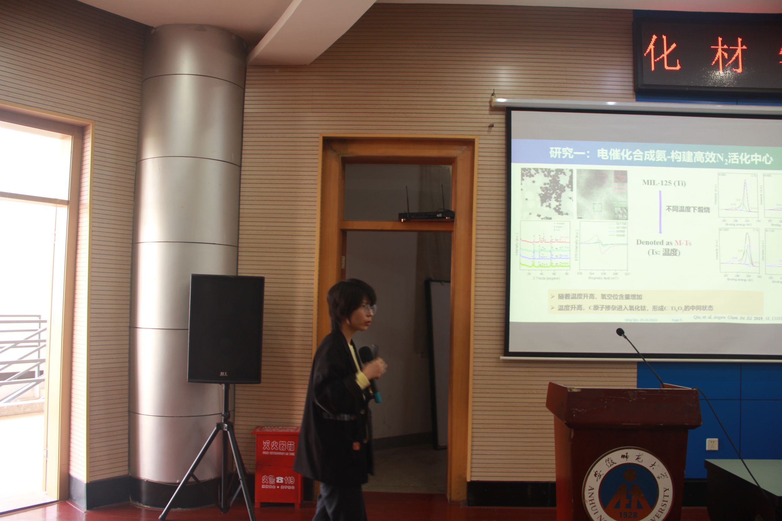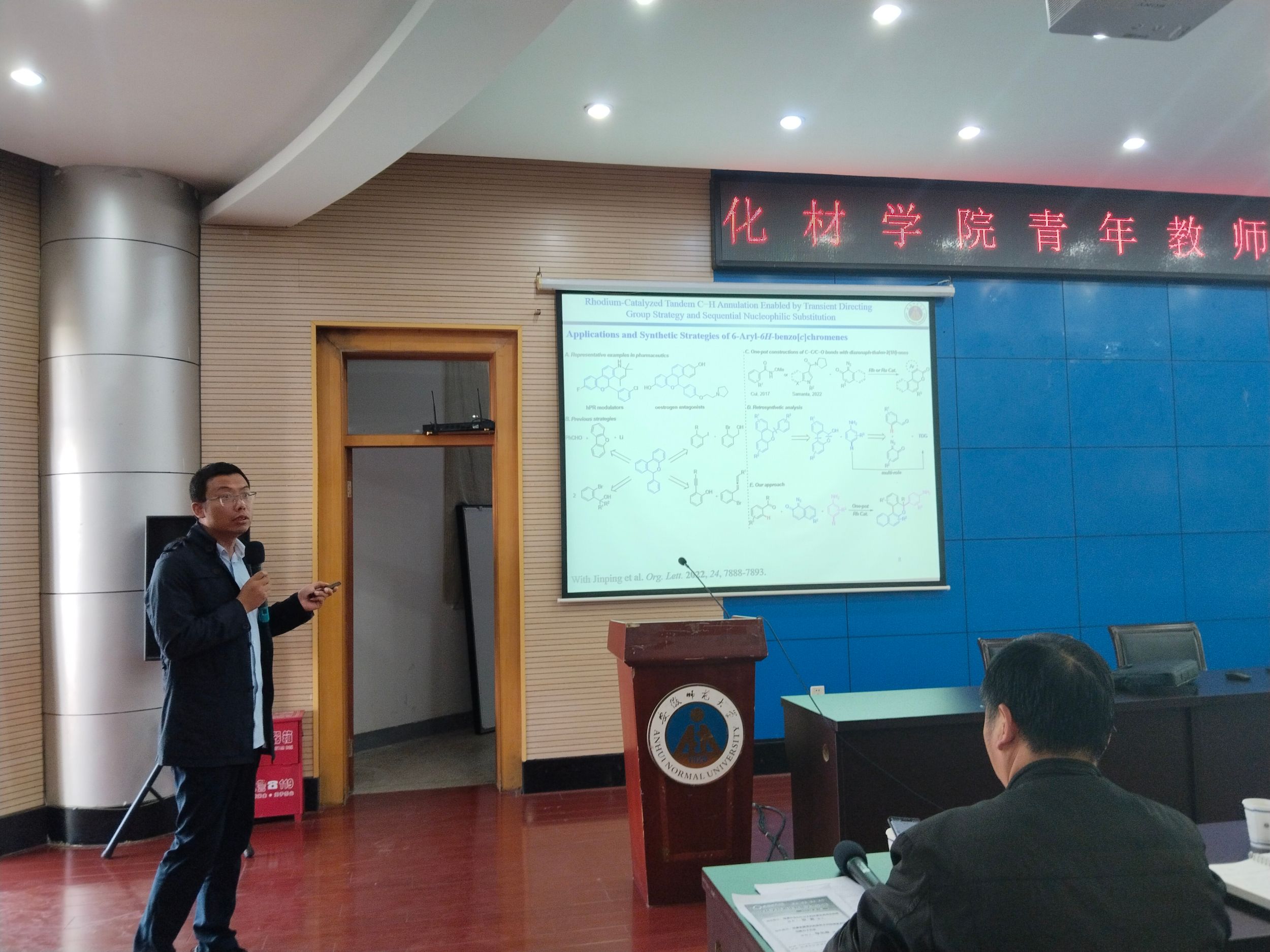 钦青博士和李忠原博士分别作了题为“电催化含N小分子的还原及其综合利用”、“过渡金属催化的串联不对称碳氢活化和功能分子合成”的学术报告。钦青博士介绍了在氮循环面临挑战的情况下,通过电化学手段实现绿色合成NH3路线。如通过杂原子碳掺杂进入氧空位,能够促进N2分子的活化还原。通过异质结位点调控催化中心的电子结构,抑制NO2-对Cu活性中心的毒化作用,提升NH3的活性和选择性。并设计富电子小尺寸纳米团簇作为双功能催化剂,实现高效电催化合成氨和尿素过程。李忠原博士介绍了通过瞬时导向基团策略和顺序亲核取代实现铑催化的串联C-H成环过程,详细阐述了一些有机化合物的合成策略以及应用。