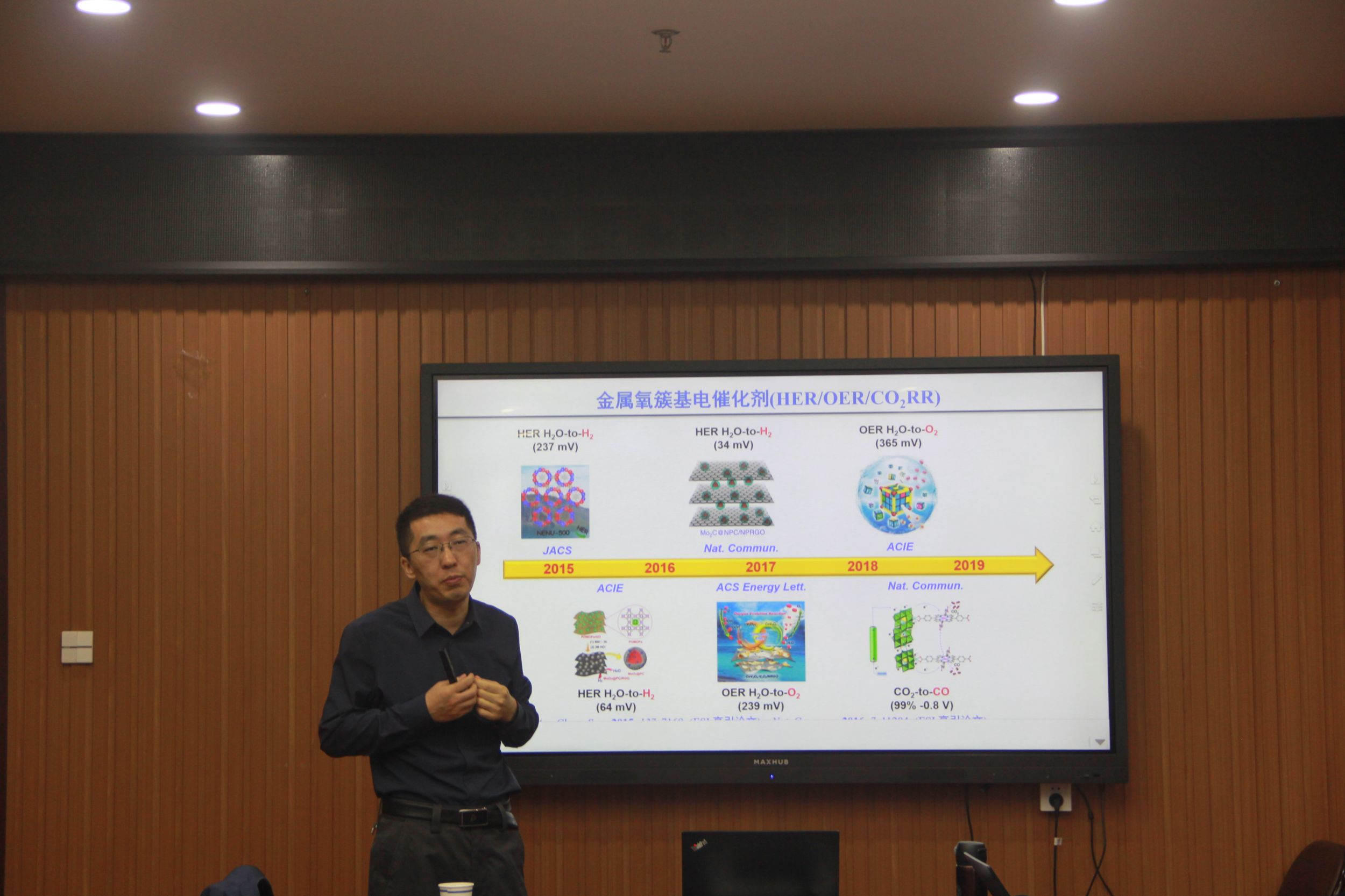 兰亚乾教授作了题为“新型金属氧簇的设计合成及光催化性能研究”的学术报告。兰教授首先介绍了多金属氧簇(多酸)具有多样的化学组成与结构,在催化、药用等方面展现出优异的性能。多金属氧簇新结构和新种类一直是金属氧簇合成上的重要挑战, 功能应用研究是金属氧簇化学发展的动力和源泉。随后兰教授讲解了其课题组近年来设计合成了一系列新型金属氧簇并研究其催化性能。在金属氧簇合成上:1、提出了金属钼氧簇组装新理念,设计合成了钼红系列巨型金属氧簇,打破了保持20年的金属簇核数和分子量的纪录;2、拓展了金属氧簇种类(第IVB族和第IIIB族),成功合成了系列非富勒烯结构的60个金属顶点M60多面体金属氧簇。在性能研究方面上:1、提出了分子结的概念,通过对不同异团簇的组装,多组分协同实现光合作用的人工模拟;2、设计合成和系列光、电、热敏感的新型金属氧簇光催化剂,并将其用于多功能光-电/光-热有机氧化催化体系,为构筑高效稳定的金属氧簇光催化剂设计提供了新的策略。会后,兰亚乾教授回答了参会师生提出的一系列问题。