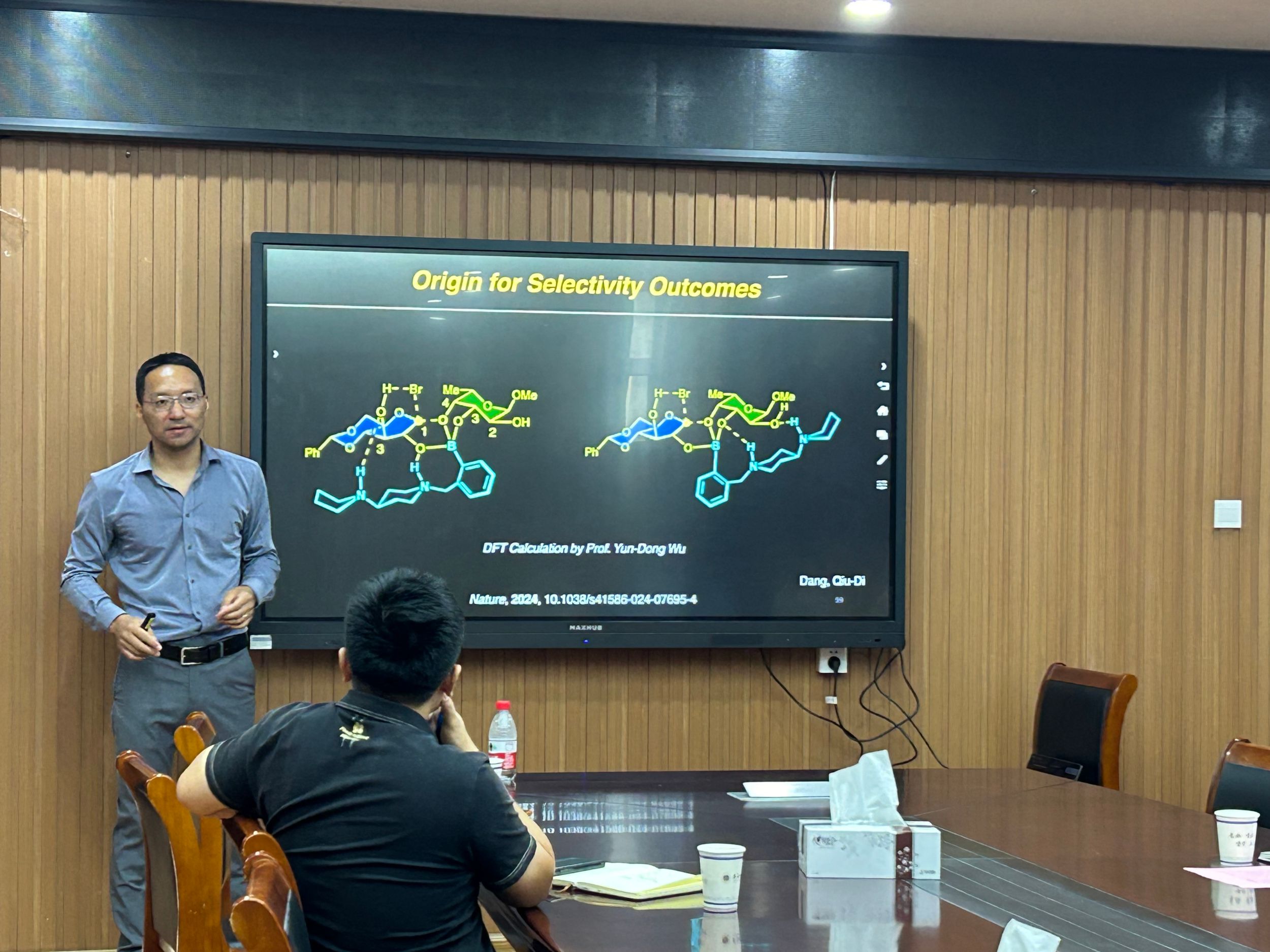 钮大文教授作了题为“Liberate Glycosylation from Protecting Groups”的学术报告。钮教授介绍受到一些生物化学家的启示,他们提出、设计、开发了“非氧鎓离子路径糖基化反应”,为克服糖苷键构筑领域长期面临的官能团兼容性和立体选择性挑战提供了新思路;基于金属催化反应平台,利用识别试剂控制,为实现糖类的位点可调控修饰建立了新策略。报告结束后,现场参会师生踊跃积极提问,钮大文教授与师生积极互动,对师生们提出的问题进行了耐心且细致的解答,学术交流氛围浓烈。