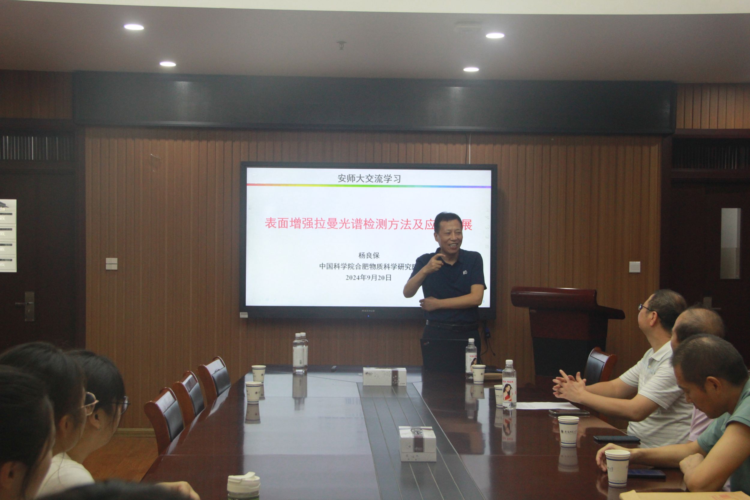 杨良保研究员作了题为“表面增强拉曼光谱检测方法及应用拓展”的学术报告。杨良保研究员首先介绍了表面增强拉曼光谱技术以及拉曼光谱的优势与特点,并讲解了表面增强拉曼光谱在基础科学研究和生产生活中的应用。随后杨研究员讲解了表面增强拉曼光谱的应用实例,主要涉及毒品毒物的检测。最后杨研究员对表面增强拉曼光谱技术的应用发展方向进行了基本研判,阐明了表面增强拉曼光谱技术的三个领域拓展方向,一是SERS针灸分子学方向,二是肿瘤标志物检测,三是致病微生物检测。会后,杨良保研究员与与会师生展开了一系列学术讨论,并回答了与会师生提出的问题。