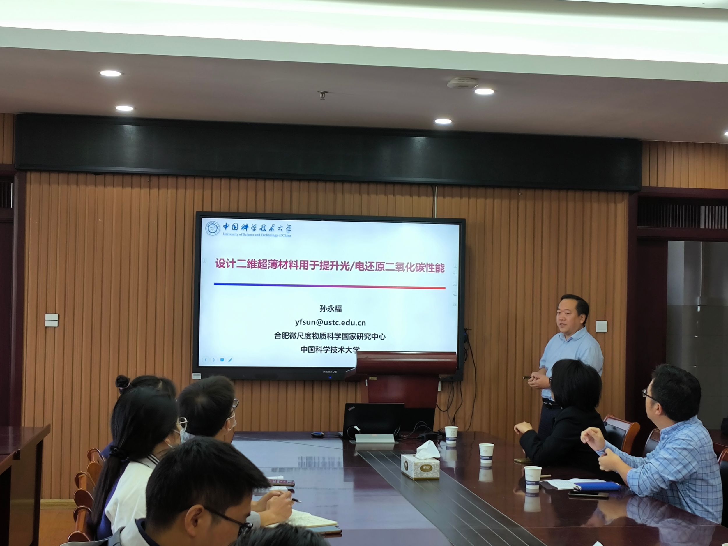 孙永福教授作了题为“设计二维超薄材料提升光、电还原二氧化碳性能”的学术报告。孙教授从温室气体带来极端气候和习近平总书记提出碳达峰和碳中和两个方面引入,介绍了如何实现二氧化碳的捕集、利用封存,太阳能、电能驱动的二氧化碳还原,二维超薄催化剂用于提升还原二氧化碳性能等三个方面的内容。孙教授不仅讲解了如何设计并制备四原子层厚钴基二维片,用于实现二氧化碳分子的活化和工业电流密度下二氧化碳还原制甲酸盐,还阐述了设计优化基于气体扩散电极的流动电解池的方法及如何制备抗溶胀阴离子交换离聚物修饰的铜纳米片。最后,孙永福教授阐述了流动电解池相较于传统H型电解池的优点,形成了“气-液-固”三相界面,气态二氧化碳被直接输送至催化剂表面,缩短气体扩散路径,加速传质过程。会后,孙永福教授与与会师生展开了一系列学术讨论,并回答了与会师生提出的问题。