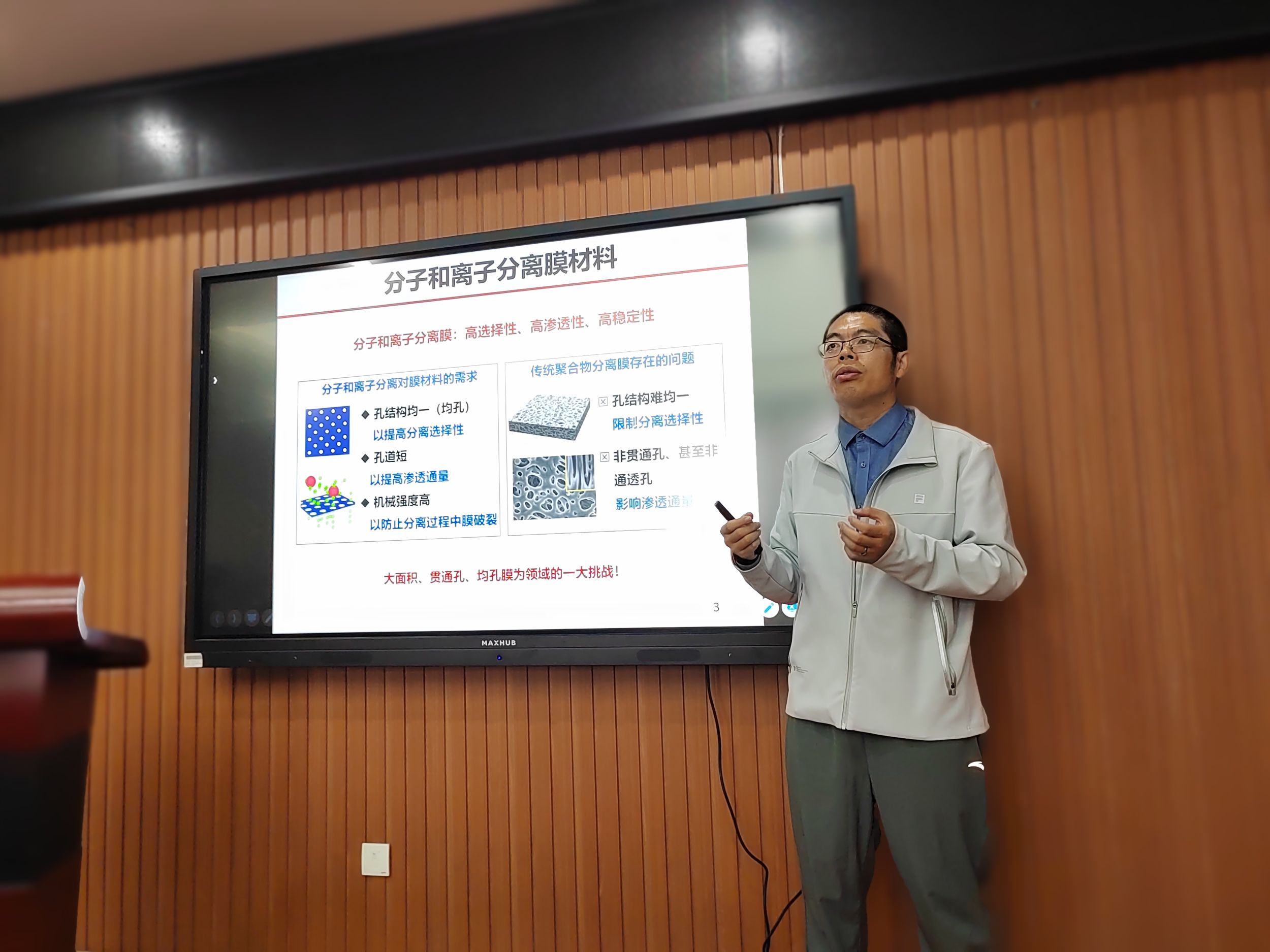 郑治坤教授作了题为“大面积晶态聚合物均孔膜”的学术报告。郑教授首先介绍了分子和离子分离膜的研究背景,包括分子和离子分离对膜材料的需求,传统聚合物分离膜存在的问题,现阶段存在的问题以及目前的研究思路。随后,郑教授从结晶过程控制合成贯通孔单晶纳米片,组装过程控制合成大尺寸微晶和晶界工程提高分离膜机械强度三个方面讲解了大面积晶态聚合物均孔膜。会后,郑治坤教授与与会师生展开了一系列学术讨论,并回答了与会师生提出的问题。