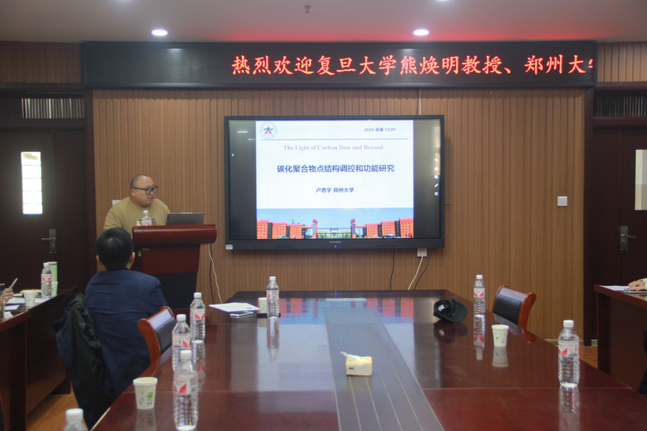 卢思宇教授作了题为“碳化聚合物点的结构调控与功能”的学术报告。卢教授首先介绍了碳点材料的研究背景。碳点是一种新型的纳米材料,具有良好的光学性质和生物相容性。因此在生物医学、光电材料等领域有着广泛的应用前景。随后卢教授结合自己课题组开展的工作,阐述了通过配体诱导量子成核和固态发光的精准调控等例子,多方面介绍了碳点的最新研究领域。会后,卢思宇教授与与会师生展开了一系列学术讨论,并回答了与会师生提出的问题。