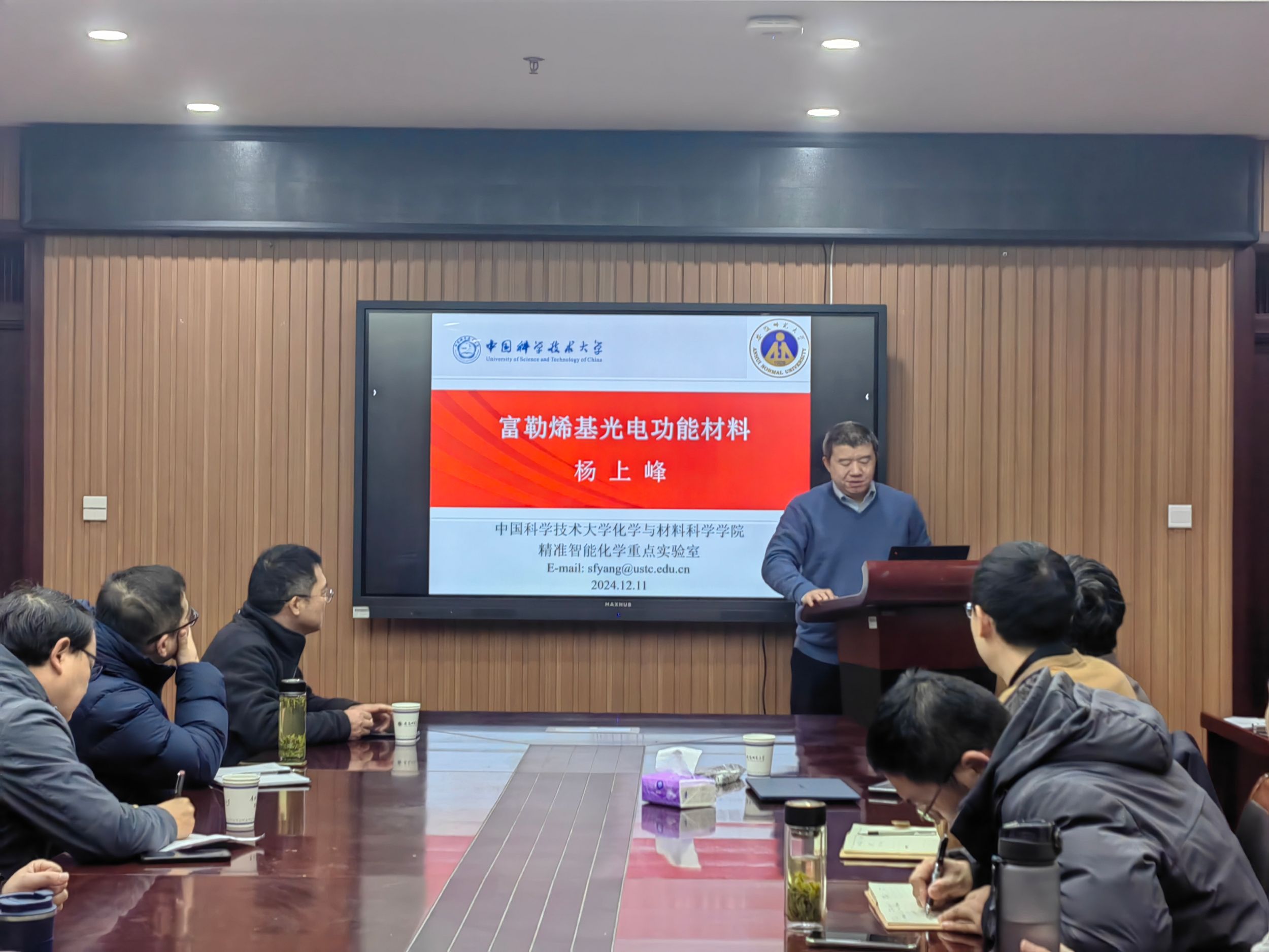 杨上峰教授作了题为“富勒烯基光电功能材料”的学术报告。杨教授首先介绍了富勒烯材料的结构、性质、潜在应用和工业应用。富勒烯是一类完全由碳原子组成的分子,其结构类似于足球的形状,由12个五边形和一定数量的六边形组成。最著名的富勒烯是C60,它含有60个碳原子,形成一个几乎完美的球体。随后,杨教授重点介绍了富勒烯的最新研究领域以及其在电催化中的应用。会后,杨上峰教授与与会师生展开了一系列学术讨论,并回答了与会师生提出的问题。