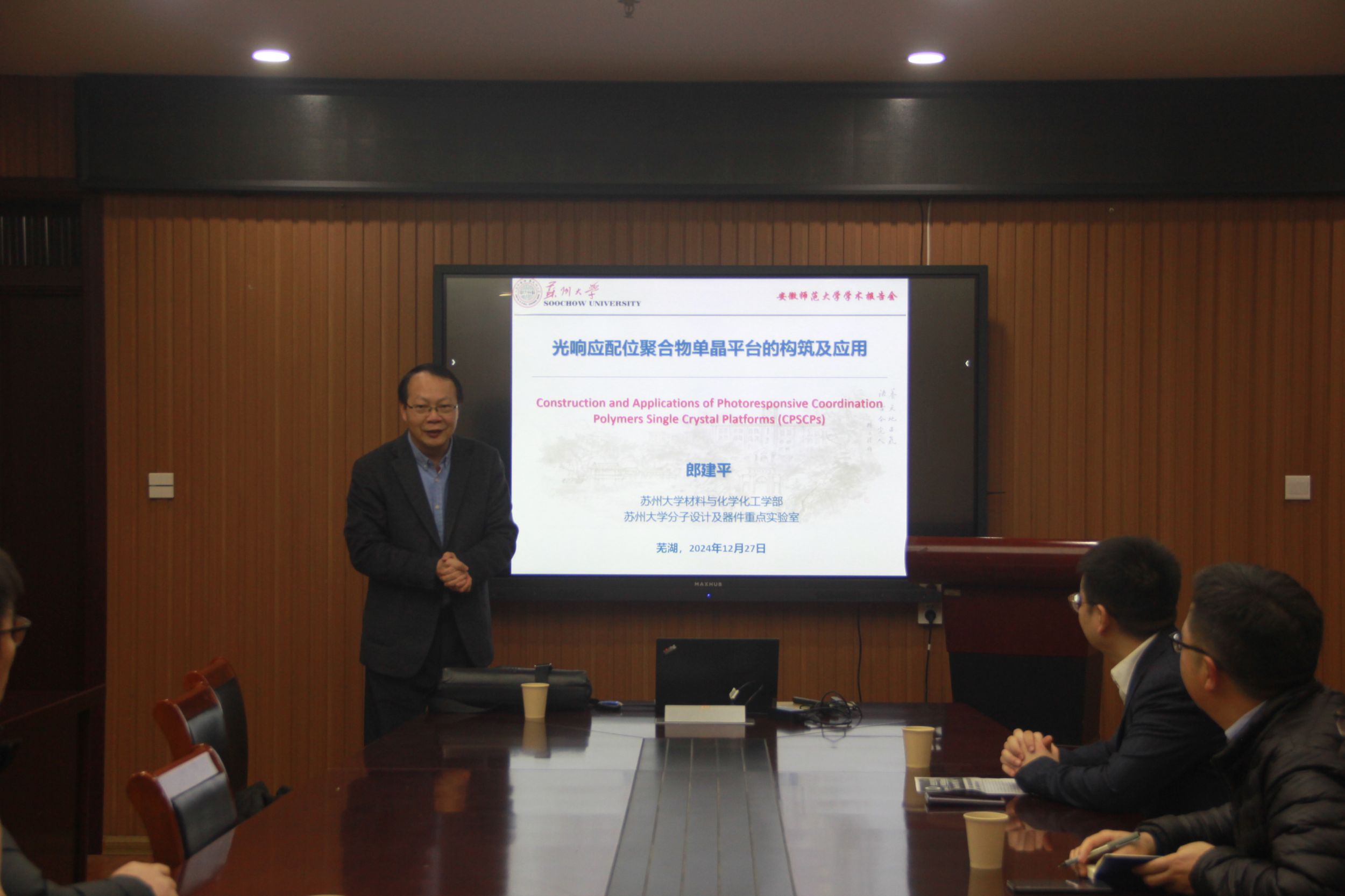 郎建平教授作了题为“光响应配位聚合物单晶平台的构筑及应用”的学术报告。郎教授首先从教科书中经典的周环反应出发,对晶态配位聚合物结构中的光化学[2+2]环加成反应和光响应性配位聚合物单晶平台的研究背景进行了阐述,分享了其课题组近年来在基于配位聚合物单晶平台合成环丁烷衍生物、反应机理原位探索和光反应前后性质原位探索领域的重要进展,随后着重介绍了固相有机和区域选择性光化学合成环丁烷衍生物、原位光化学环加成和光/热反应机理探索以及基于CPs材料的光致机械运动及光驱动柔性器件的应用。会后,郎建平教授与与会师生就报告主题展开了深入探讨,并回答了与会师生提出的问题。