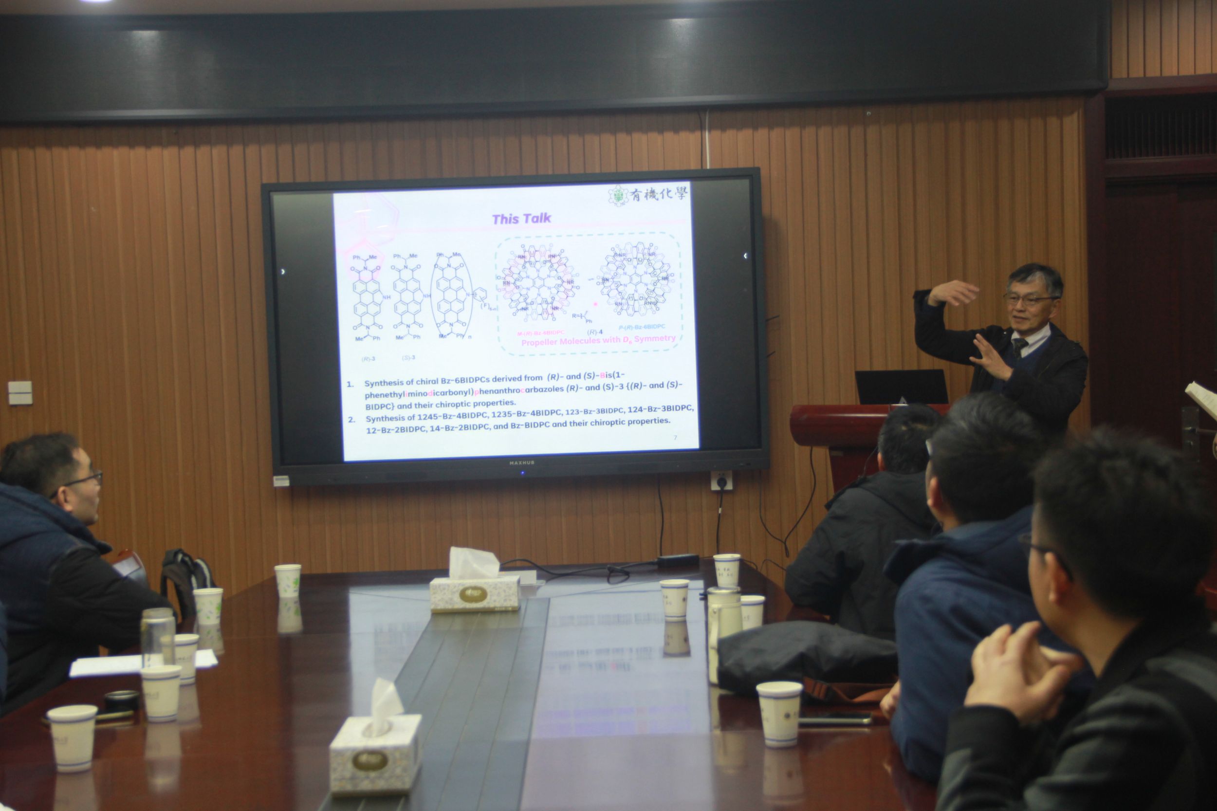 Uno Hidemitsu教授作了题为“Preparation and Chiroptic Properties of Propeller Molecules with Chiral Bis-(1-Phenylethyliminodicarbonyl)Ph-enanthrocarbazole (BIDPC)as Propeller Blades”的学术报告。Uno Hidemitsu教授讲解了其课题组设计并合成了具有高CPL活性的螺旋桨分子,并通过单晶x射线衍射和光谱分析对其结构进行了鉴定,解释了(R)-和(S)-BZ-6BIDPCs的CD和CPL光谱与(R)-和(S)-1-苯乙基亚氨基诱导的螺旋桨手性呈镜像关系。有趣的是,BZ-6BIDPCs在各种溶剂中表现出相似的紫外可见光谱,但CD光谱随溶剂和温度的变化而变化。会后,Uno Hidemitsu教授和与会师生展开了一系列学术讨论,并回答了与会师生提出的问题。