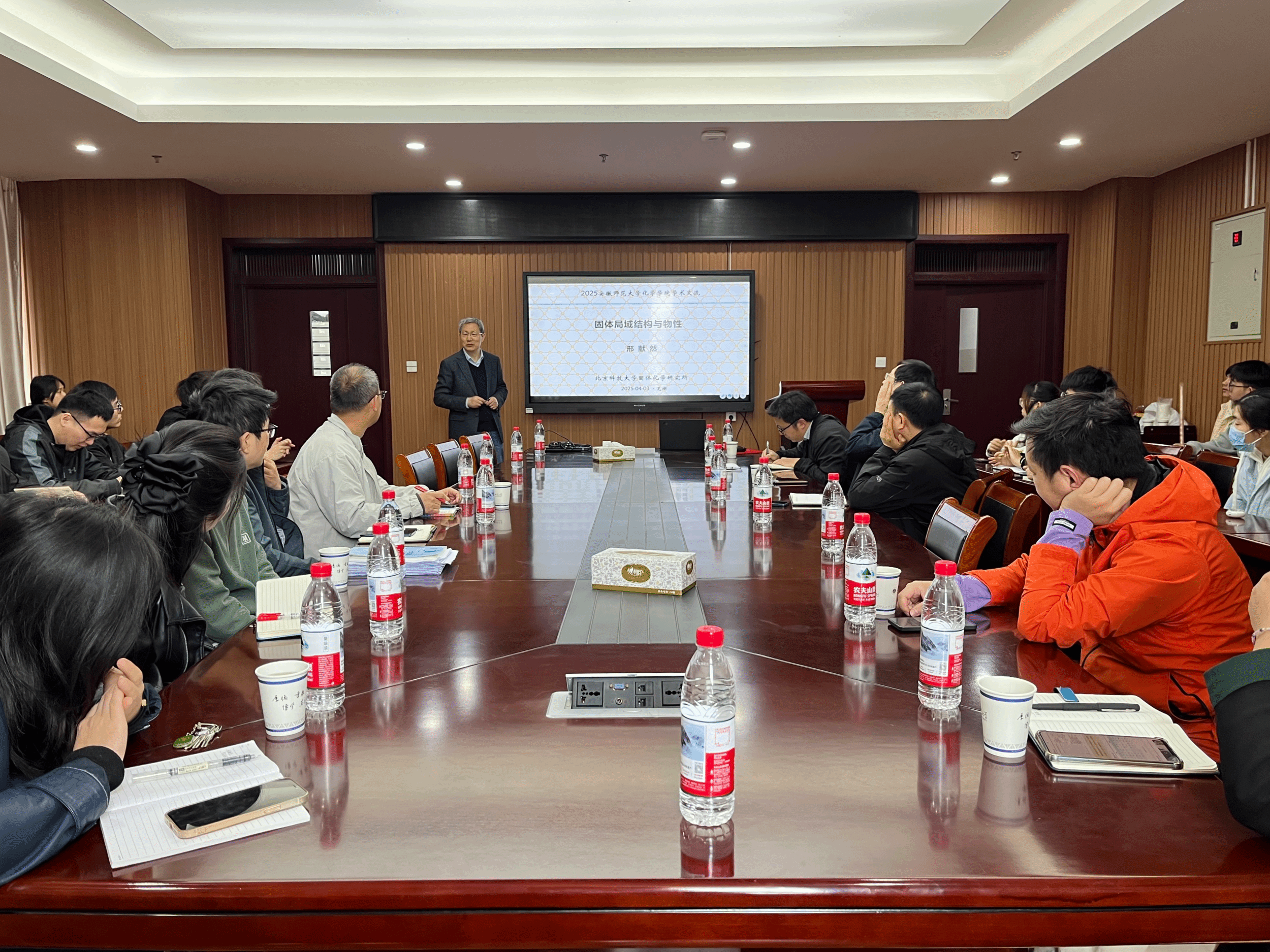 邢献然教授作了题为“固体局域结构与物性”的学术报告。邢教授首先从物质结构的基本概念出发,点出了"结构决定性质"这一核心科学命题。随后邢教授强调在局域结构尺度(nÅ~n nm范围内),原子的排列方式(包括对称性、化学组成和原子排布三个维度)直接决定了材料的性能表现。接着邢教授重点介绍了中子/X射线全散射技术。该技术基于中子/X射线全散射数据,能够同时获取材料的长程晶体结构和短程局域结构信息,为建立原子尺度化学键合与纳米尺度功能特性之间的关联提供了强有力的研究手段,在局域结构研究中发挥着不可替代的作用。最后,邢教授分享了课题组在局域结构研究领域取得的一系列重要进展:通过纳米SrTiO3体系揭示了介局域结构与非常规铁电性的内在关联;在PtFe合金体系中阐明了局域结构对HER催化性能的调控机制;利用PdCu双金属催化剂体系,解析了乙炔加氢反应中表面局域结构的催化作用机理。会后,邢教授与参会师生就报告内容展开了一系列讨论,并回答了与会师生提出的问题。