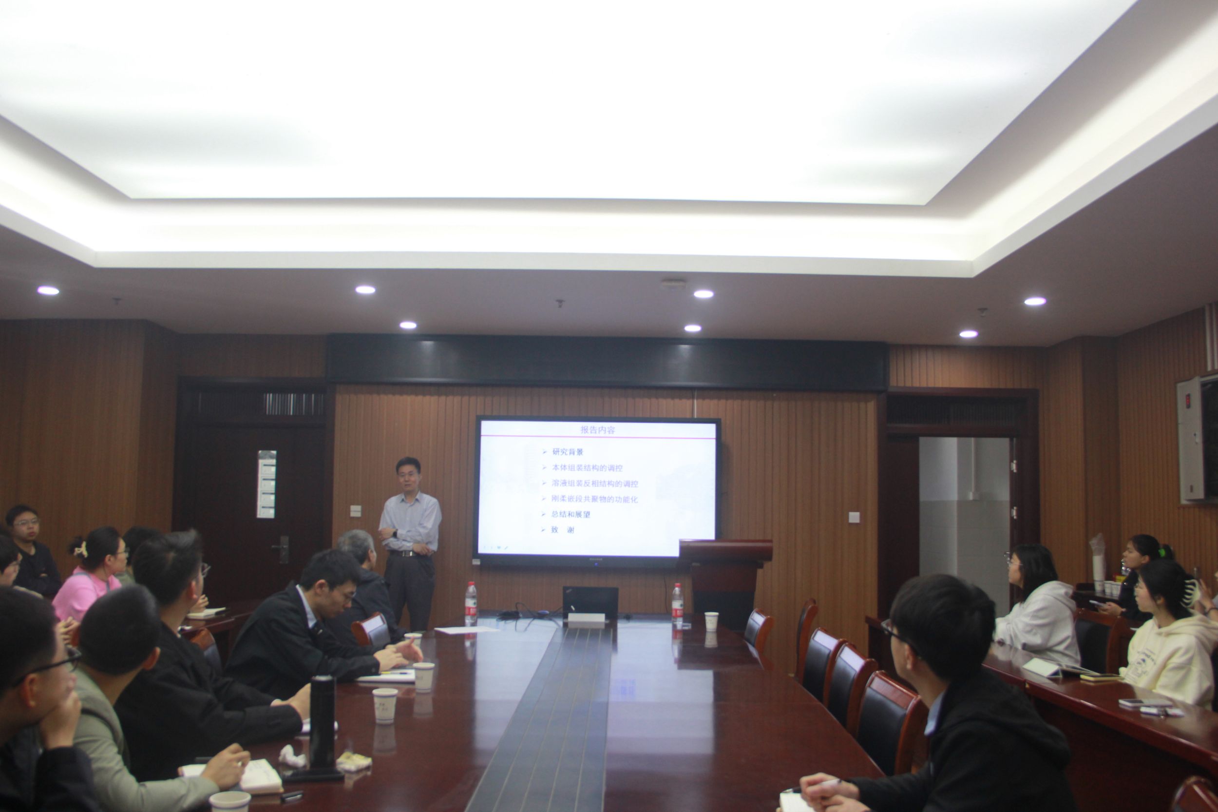 沈志豪教授作了题为“刚柔嵌段共聚物的结构调控和功能化”的学术报告。沈教授首先介绍了嵌段共聚物自组装及其应用,涵盖微相分离、自组装,涉及工业化应用如热塑性弹性体,以及前沿方向的光子晶体、纳米模板等。随后沈教授讲解了含刚性链段的嵌段共聚物作为解决方案,面临刚性链段可控合成挑战,引出甲壳型液晶高分子(MJLCP)。接着沈教授分别从本体组装结构的调控、溶液组装反相结构的调控、刚柔嵌段共聚物的功能化三个方面进行了详细介绍。最后沈教授进行了总结与展望:可通过改变组成、环境条件等调控刚柔嵌段共聚物组装结构,获得多种双连续网络结构和亚纳米组装结构;刚性甲壳型液晶高分子链段赋予聚合物电解质更好热稳定性,大面积取向有序结构可提高聚合物电解质离子电导率等。会后,沈志豪教授与在场师生积极互动,回答了师生们的问题。
