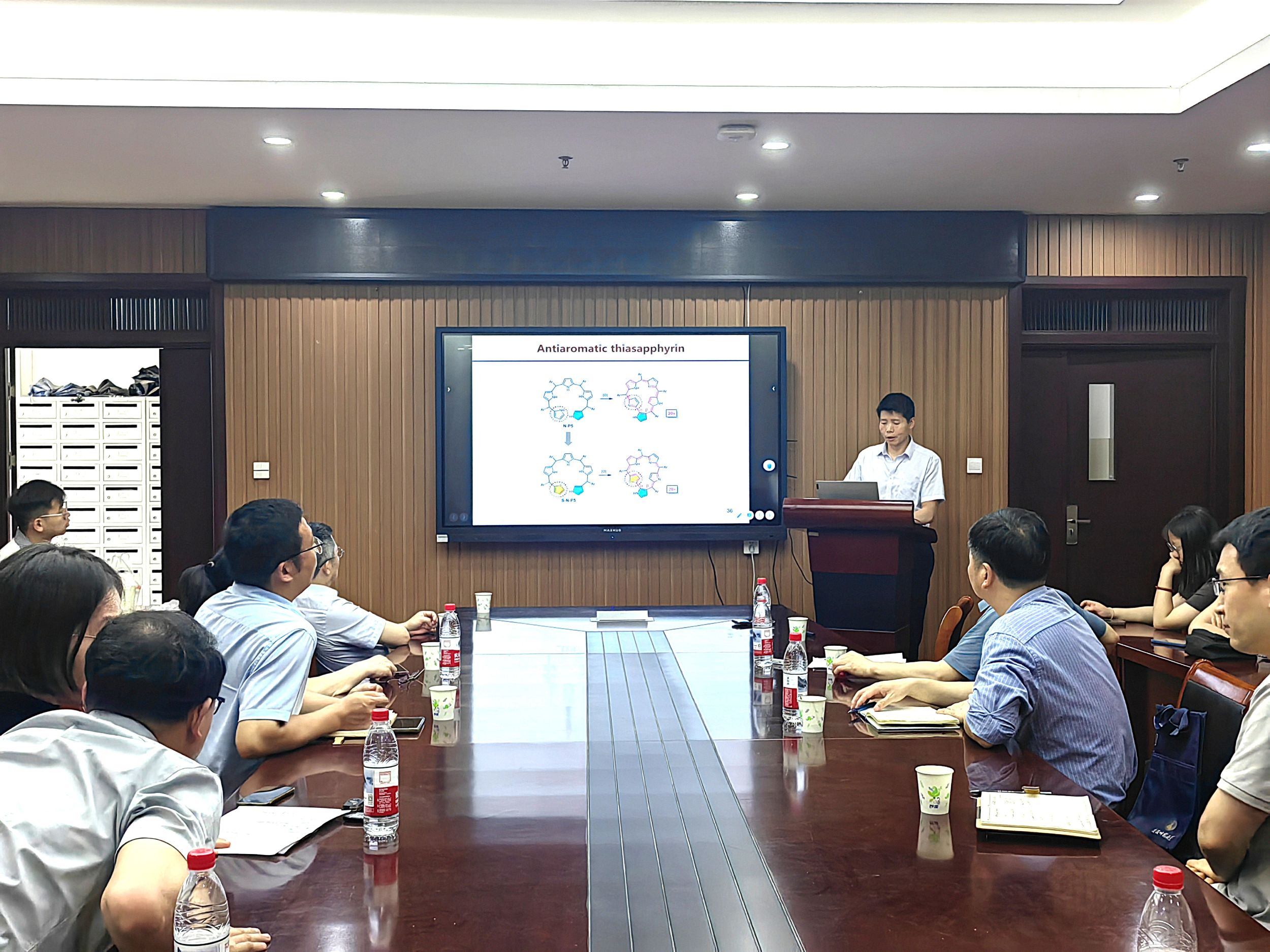 解永树教授作了题为“新型卟啉的合成与光电性能研究”的学术报告。报告聚焦于双协同伴侣染料(DCC)的设计与应用,通过分子结构的精准调控(如XYM系列染料组合)及光谱优化,显著提升了染料敏化太阳能电池的光电转换效率。解教授研究团队通过实验验证了DNGO基材料的性能优势,为高效太阳能电池的开发提供了新思路。此外,解教授深入探讨了抗芳烃卟啉类化合物的合成与特性,通过错位连接、杂原子引入等策略,成功构建了具有独特反芳香性的新结构,并揭示了其在自由基稳定化及超分子组装中的潜力。解教授还展望了共敏化技术的未来发展方向,强调多组分协同效应对光能捕获与电荷传输的革新意义。会后,解永树教授与在场师生就报告内容展开热烈讨论,并就太阳能电池参数优化、卟啉类化合物的生物医学应用等问题进行了深入交流。