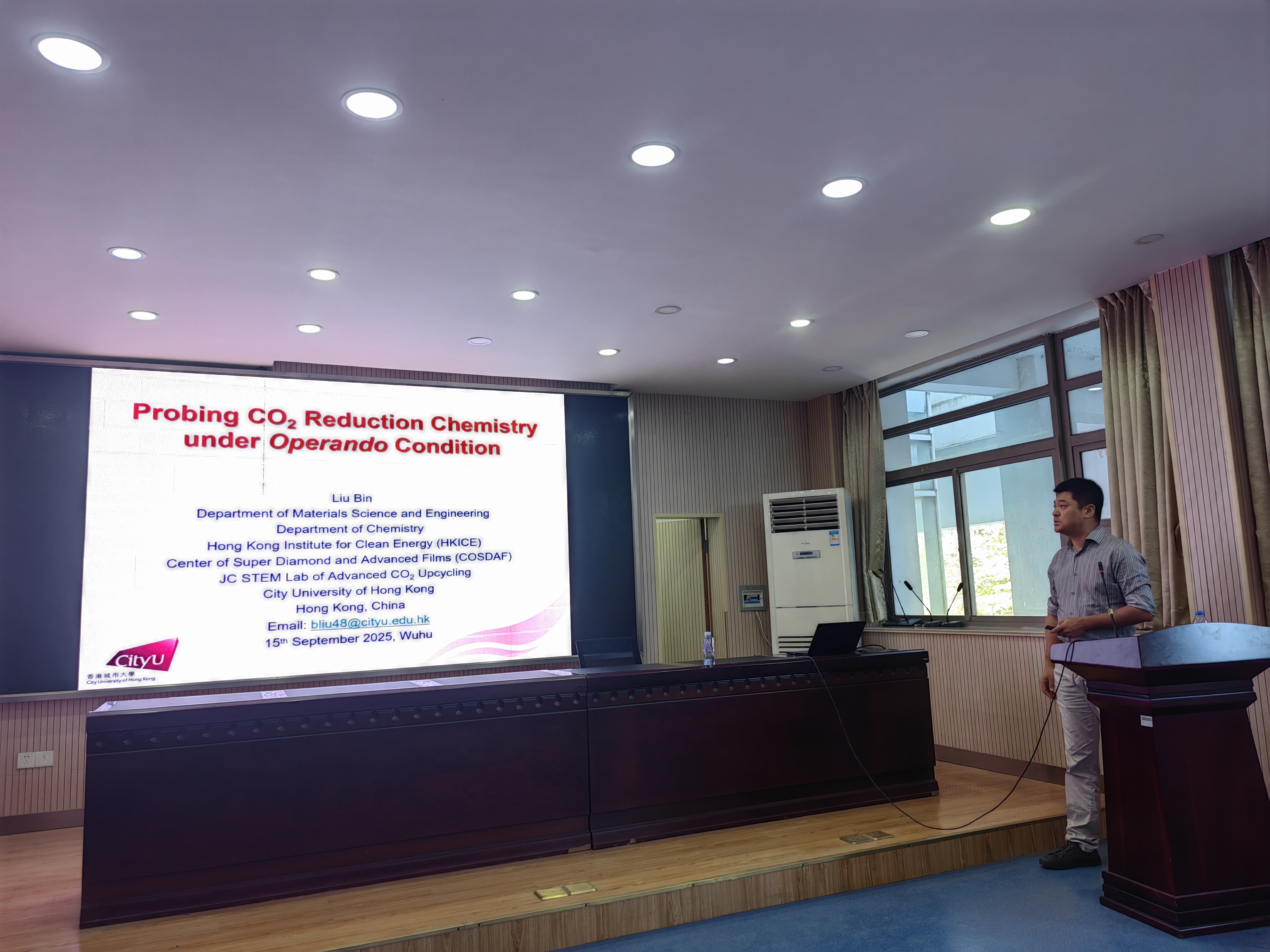 刘彬教授围绕《Probing CO2 Reduction Chemistry under Operando Condition》主题展开报告,详细阐述了他在CO2还原领域的研究思路和成果。刘彬教授首先介绍了碳中和能源系统与电催化器件的构筑,指出了碳中和背景下CO2电化学还原技术的重要性,指出目前贵金属和过渡金属基催化剂在CO2还原领域因具有独特的选择性优势而受到广泛应用,然而对于催化中间体的结构以及存在于反应界面的关键物质都没有明确的解析。随后介绍了他们在开发CO2还原应用基础的动态电催化演变原位表征方面的独特研究,基于这些认识,对活性位点电子结构进行理性调控,实现二氧化碳的高效定向转化。报告的结尾刘教授介绍原位表征技术是二氧化碳还原机制的探索的关键。报告结束后,现场师生踊跃发言提问,刘彬教授耐心解答,并就实验细节问题做了进一步的交流和讨论。