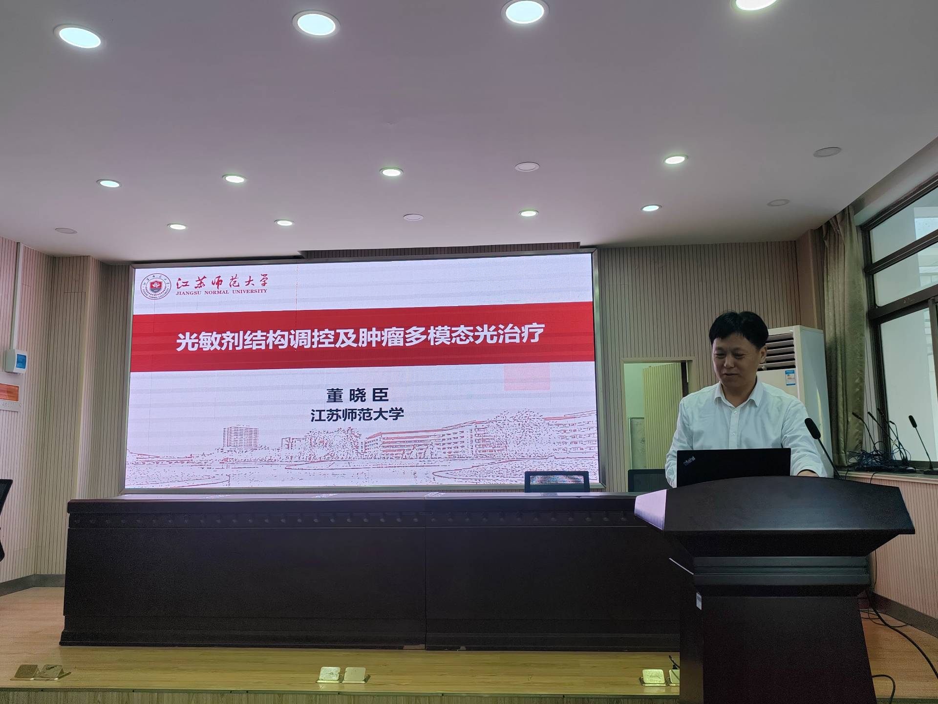 董晓臣教授作了题为“光敏剂结构调控及肿瘤多模态光治疗”的学术报告。董教授首先介绍了中国是恶性肿瘤高发区,发病率逐年持续上升,防治任务艰巨。目前使用的治疗方法有手术、放疗、化疗、光疗等。其次,董教授简要介绍了光治疗的原理,通过光敏剂结构的合理设计与调控,可以进行成像引导的多模态肿瘤治疗。肿瘤微环境具有三个明显特性:酸性环境,乏氧状态,血管异常。针对酸性环境特性,使用肿瘤微酸激活近红外肿瘤诊疗试剂,该试剂利用肿瘤微酸环境,改变光敏剂分子能级,“打开”光动力,增强光学。针对乏氧的特性,通过光敏剂负载DOX与全氟碳,以增加氧气浓度同时实现超声/光声/荧光成像。在针对肿瘤血管异常特性,利用肿瘤微环境响应,有效破坏肿瘤血管,防止肿瘤增殖及转移。此外TypeI光动力治疗联合血管阻断,提高乏氧肿瘤治疗效率,可有效抑制肿瘤血道肝、肺转移。会后,董晓臣教授与会师生展开了一系列学术讨论,并回答了与会师生提出的问题。