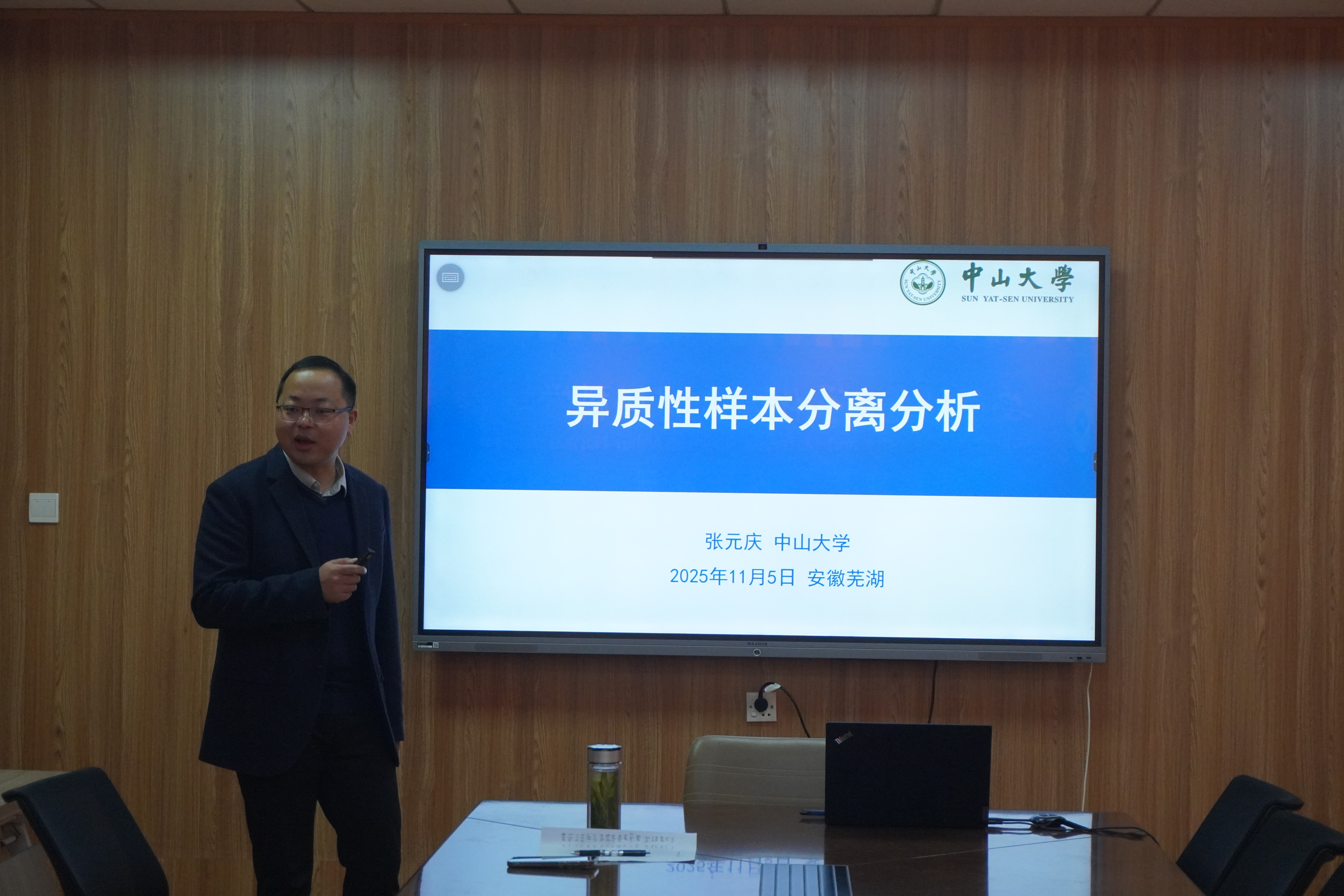 张元庆教授做了题为“异质性样本分离”的学术报告。张教授系统介绍了本报告围绕异质性分析的核心瓶颈展开,重点介绍微纳技术驱动的解决方案。张元庆教授首先明确关键科学问题:需解决微纳尺度分离的无偏富集、低成本高通量检测、低干扰高灵敏度分析等难题。随后展示三项核心工作:其一,通过生物膜界面精准调控,构建锁钥匹配型磁分离体系,实现亲和力提升800倍的无偏富集;其二,开发位置-荧光微球条形码芯片,以多维度微球制备实现200种以上样本的高通量检测;其三,利用物理膨胀+膜融合技术,完成单囊泡多组学可视化分析,解决小尺寸样本的多维度检测难题。这些技术突破为异质性样本的精准分离与分析提供了新工具,可支撑肿瘤等复杂样本的深度研究。会后,张元庆教授与会师生展开了一系列学术讨论,并回答了与会师生提出的问题。