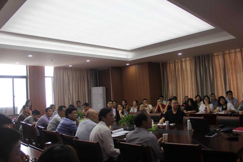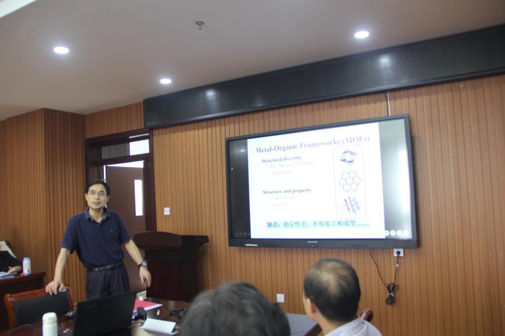 孙为银教授作了题为“多孔金属-有机框架材料的构筑及其性能研究 ”的学术报告。孙教授由多孔金属-有机框架材料在识别探针、催化转化、微纳材料、惰性键活化等四个方面的应用引入报告,从分子筛的优缺点出发引出金属有机材料,集合限域空间化学的四大特点:浓缩效应、加速效应、高选择性、特殊反应,进一步引出选择性2+2加成反应,最后结合自己课题组的工作探讨了多孔金属-有机框架材料中混合配体,控制合成MoFs材料,增加结构配体,混合多样性,N2、CO2吸附配体对材料性能影响进行了深入解析,孙教授还在会后与与会师生们进行了热烈讨论,师生们都觉得受益匪浅。