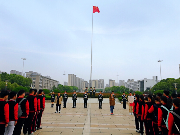 早晨七时,敬文图书馆东广场,晨光熹微,全体2018级化材学子早已列队整齐,肃然站立。朝阳初升,校国旗护卫队迈着铿锵的步伐,走向国旗台,随着《义勇军进行曲》的旋律响起,升旗手振臂高挥,国旗冉冉上升。化材师生齐唱国歌,行注目礼,目视着国旗迎风飘扬。