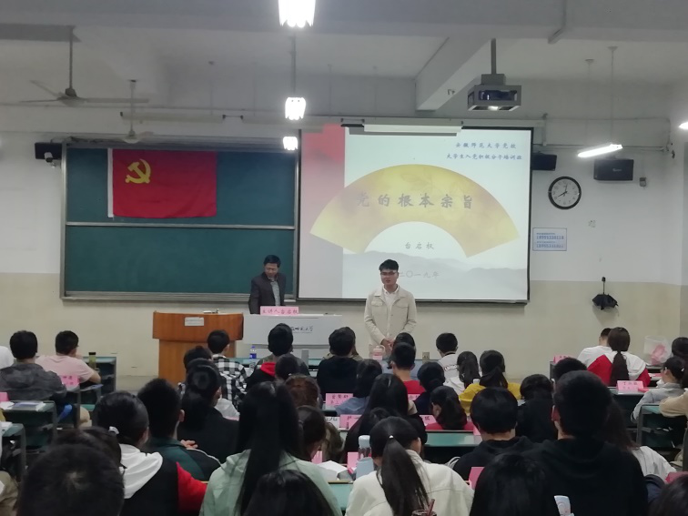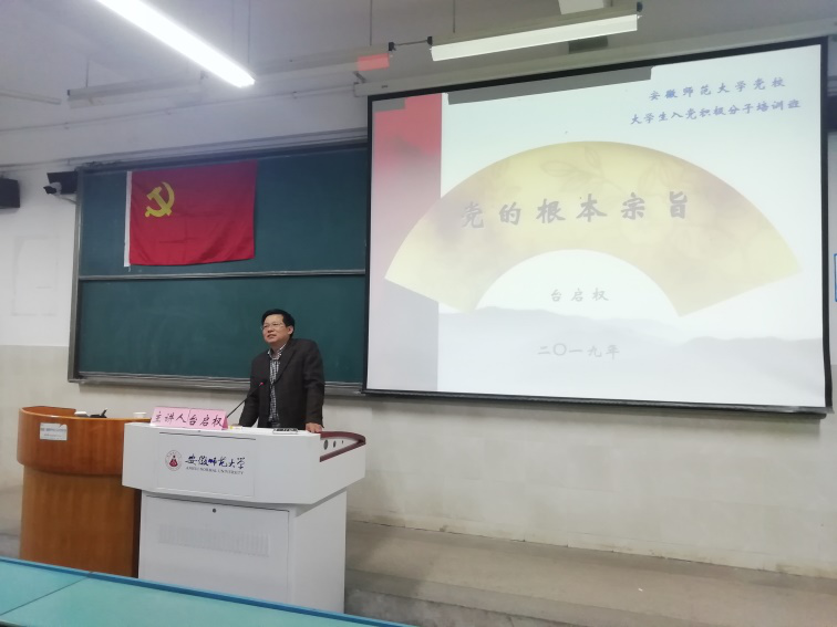分党校第26期入党积极分子培训班理论课第四讲,在行知楼2010404教室如期举行。安徽师范大学资产与实验室管理处台启权处长应邀为本院入党积极分子培训班学员进行了“党的根本宗旨”专题授课。本次党课由化材学院党校班班主任陶勇老师主持。