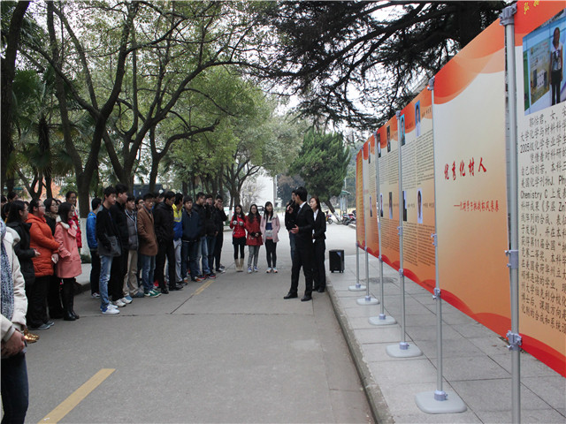 赢至高荣耀,攀科学巅峰!为培养学生的科学兴趣,激发科学梦想,培养创新精神,学院以诺贝尔化学奖获得者、“两弹一星”功勋科学家的科学精神为主题,以展板介绍的形式展示了百年诺贝尔奖的颁发历程中诺贝尔化学奖得主的科学故事和科学精神,介绍了23位“两弹一星”功勋科学家为新中国科学发展做出的巨大贡献,讲述了这些民族科学家身上具有的爱国奉献、勇于攻关和执着科学的精神品质。同时,学院还向同学们介绍了李亚栋院士等杰出院友的成长历程,介绍了中国青少年科技创新奖获得者蒯龙等同学们身边的科研榜样。学院1523名同学以班级和专业为单位,举办了31场专题解说。每次听完讲解后,同学们都踊跃在留言板上写下听后感,纷纷表达这些科学家的故事和他们身上所具有的科学品质多自己的激励,正如15级材化的赵启正同学留言到:“前人的科学足迹一次次的为我们揭示了科学奥秘,前人的科学精神也将引领着我们进一步去探寻科学世界。他们是我们的成长榜样,立志成才,奋斗不息!”
