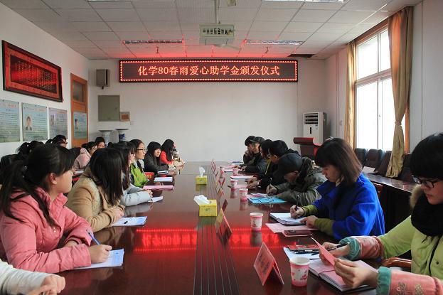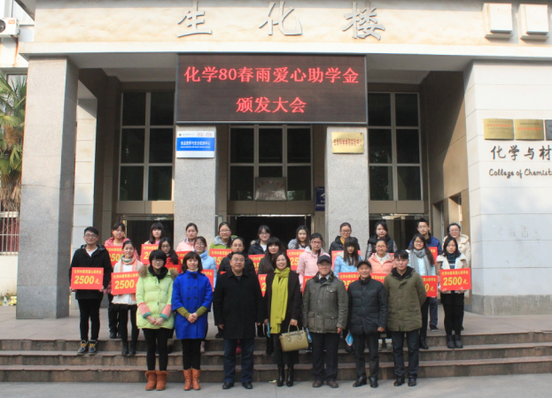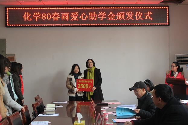 举行“化学80春雨爱心助学金”颁发仪式。“化学80春雨爱心助学金”资助人代表林勇女士,校教育基金会理事、副秘书长傅乐义,校教育基金会副秘书长贡植斌,卡通色情