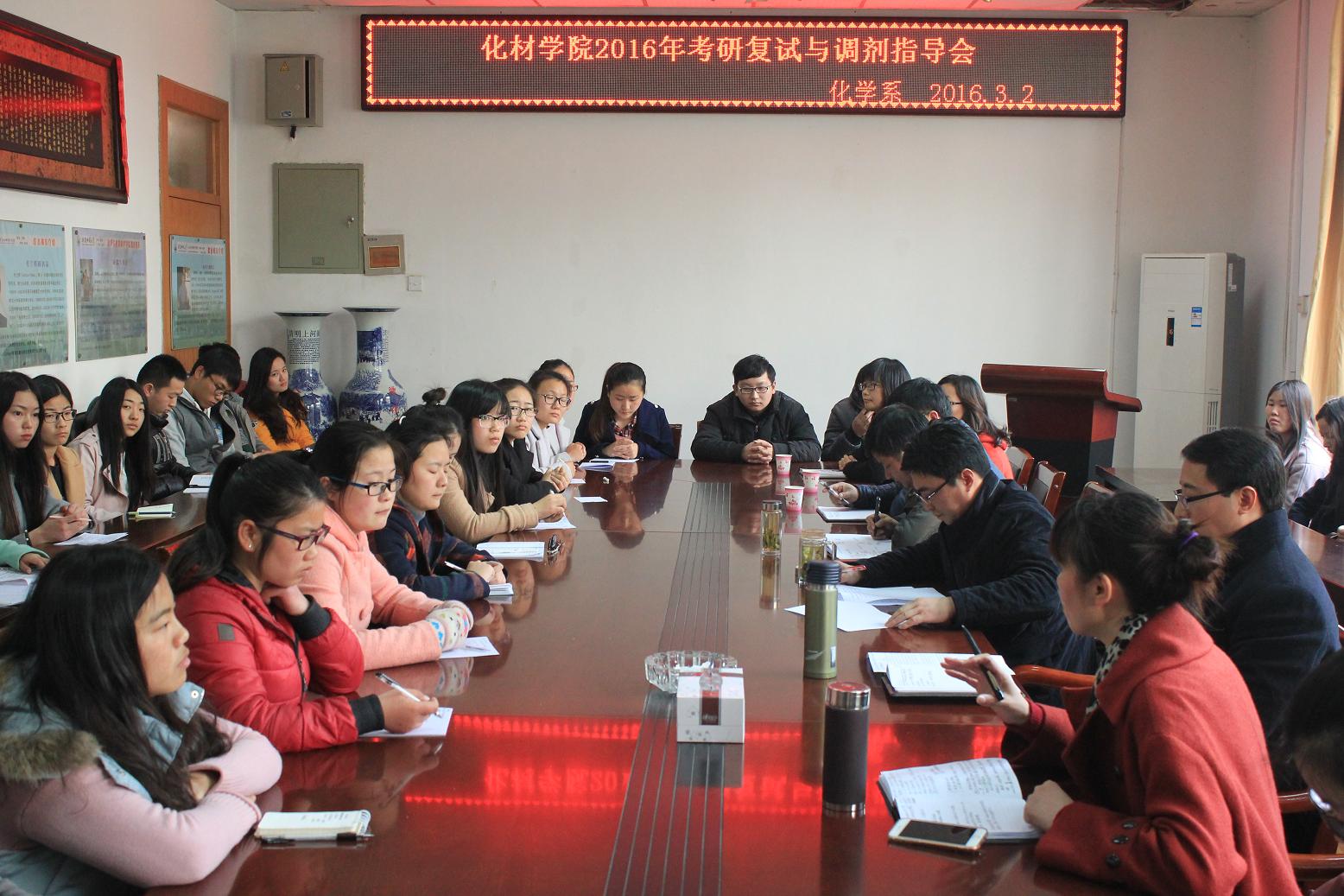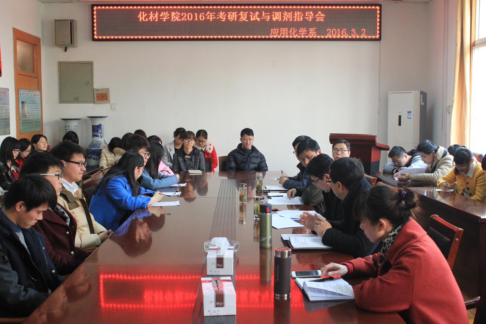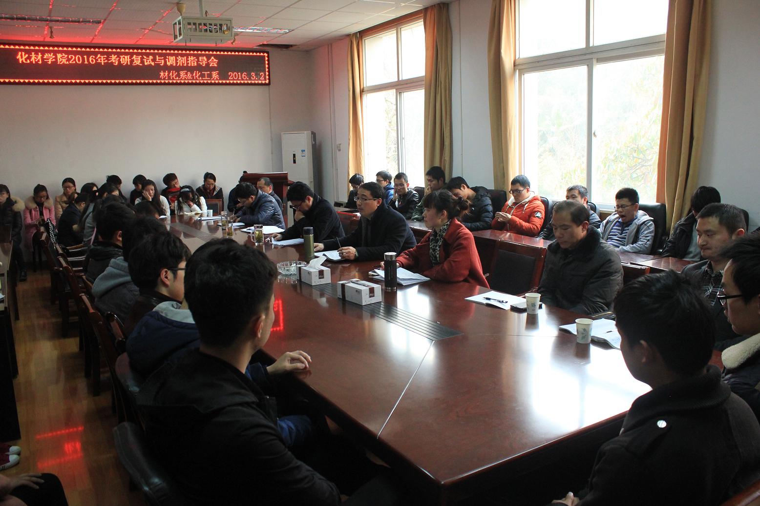 在生化楼二楼院大会议室分系举办考研复试与调剂指导会。院党委书记汪俊武、院长高峰、副院长周双六、张小俊以及各系主任、辅导员亲临现场。会议由院党委副书记余妍霞主持。