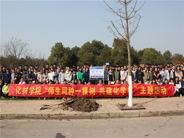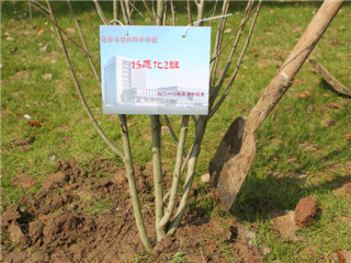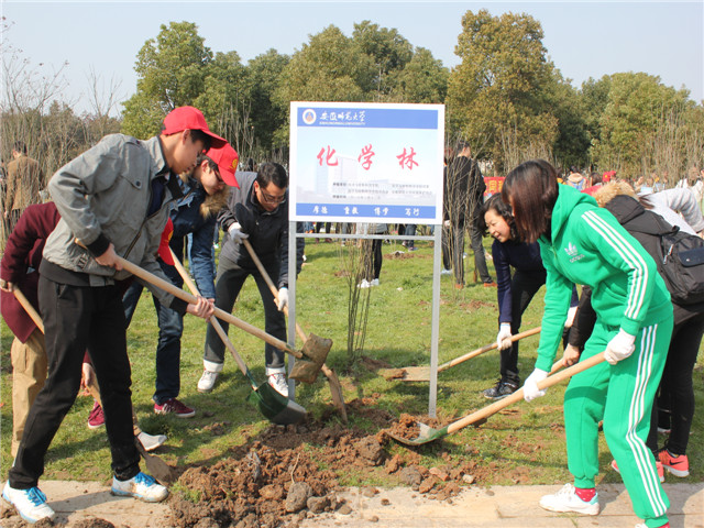 植树现场,学院领导老师及学生代表共同将“化学林”标志牌栽填直立,挺立的化学林凝聚了卡通色情