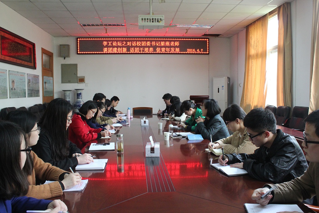 团学工作,对学院“江淮环保行”、“江淮科普学校”等团学精品活动表示认可和赞赏。梁燕结合实际案例和自身多年团学工作经验,从共青团的团章、宗旨和工作方法与艺术等方面透彻分析高校共青团工作特点和育人功能,她强调对于团的活动要坚持“从需求出发”、“从兴趣出发”和“以主体驱动”,在团组织中大熔炉中进一步培养“有主义、有信仰、有情怀”的青年大学生。在谈及具体的团学工作开展时,梁燕指出要坚持“围绕中心,服务大局”宗旨,要努力做到引领青年有方法、服务青年有载体、倾听青年有渠道和青年文化有特色,结合主题教育、志愿服务、素质拓展和社会实践等活动载体,引领大学生要争做“有态度、有温度、有深度”的优秀青年。交流会上,院学生组织干部代表和辅导员老师抓住难得的学习机会,就工作终遇到的实际问题或难题主动提问交流。梁燕认真记录、耐心回答,分析全面客观,具有极强的理论和实践指导意义。最后余妍霞进行总结发言,她首先感谢校团委对学院团学工作的指导关心和支持,同时指出这一次“学工论坛”主题鲜明、交流全面、分析透彻,为学院团学工作开展进一步理清思路明确方向,希望学院辅导员认真学习领会,并切实做好相关工作。