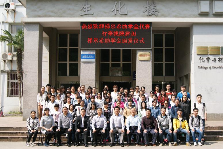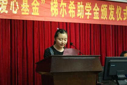 颁发仪式上,傅乐义宣读了梯尔希助学金颁发决定,并对韩冰等60名受助学生给予支持与肯定,鼓励其勤奋努力,求实创新。芮彬云代表资助人为受助学子颁发助学金并合影留念,在发言中他鼓励受助同学要自强不息,不断进取。他说:“贫困并不可怕,能够吃苦其实也是一种宝贵的精神。”他希望同学们能够接过爱心接力棒,积极奉献爱心,回报社会。14级化学专业王驰同学代表全体受助学生向化学系80级校友设立的爱心助学金表示诚挚的感谢,她表示自己在今后的学习上一定会奋发进取,心怀感恩,做爱心的传递者。