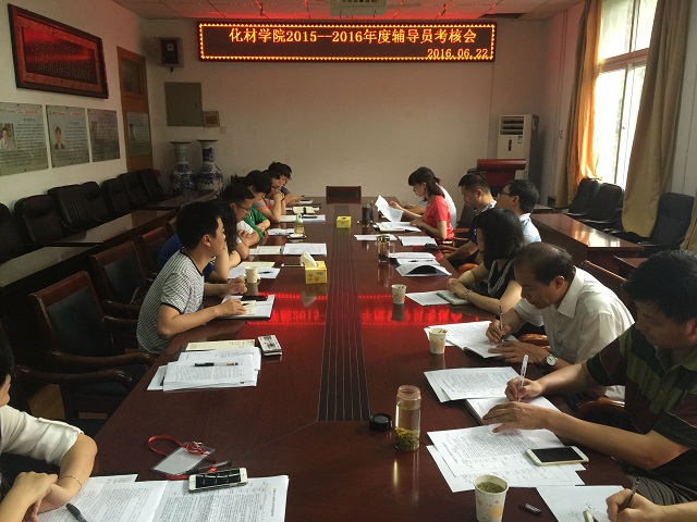 在学院大会议室举行了2015--2016学年辅导员考核会,院党委书记汪俊武、党委副书记余妍霞、副院长周双六、副院长张小俊、化学系系主任阚显文、材料化学系系主任王正华、应用化学系系主任郝二红、化学工程与工艺系系主任罗时忠及学院全体专兼职辅导员参加了考核会。