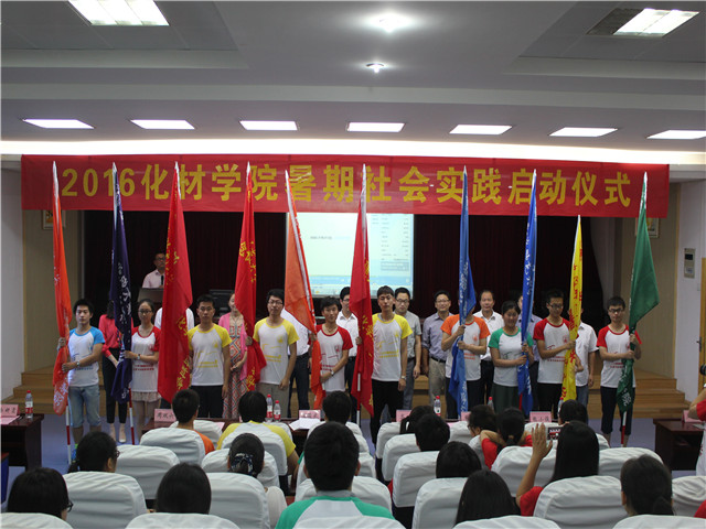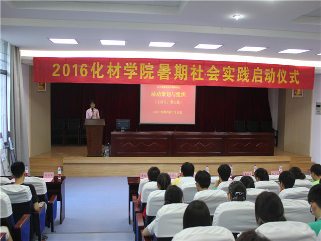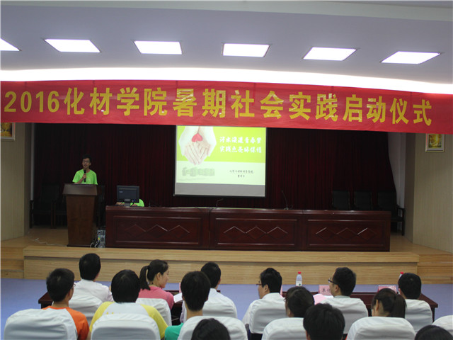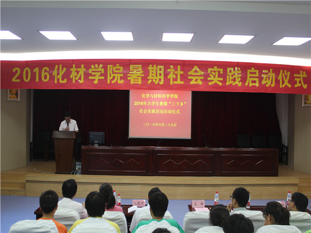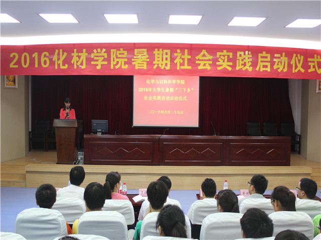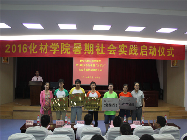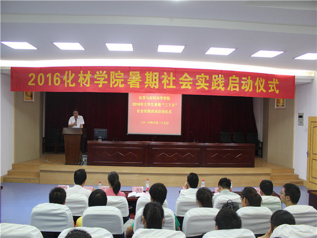 2016年大学生暑期“三下乡”社会实践启动仪式在赭山校区图书馆报告厅隆重举行。校团委副书记张园园、暑期社会实践思政指导老师单传友、院党委书记汪俊武、院长高峰、院党委副书记余妍霞、副院长周双六、副院长张小俊、材料化学系系主任王正华、化学工程与工艺系系主任罗时忠、应用化学系副主任章青及各实践团队指导教师和志愿者代表参加了启动仪式。