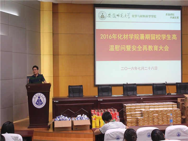 召开了2016年暑期留校学生高温慰问暨安全再教育大会。院党委书记汪俊武,院长高峰,2013级辅导员陈露、袁青兵及全体留校本科生参加了会议,会议由院党委副书记余妍霞主持。