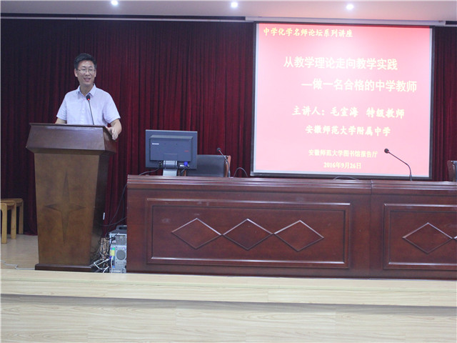 实习动员大会结束后,化学系举办了中学化学名师论坛系列讲座,来自安师大附属中学的毛宣海老师,围绕“如何做一名合格的老师”这一主题进行了讲解。毛老师从教学设计出发,向同学们详细阐述了如何去完成一份优秀的单元教学设计以及课时教学设计,并突出强调了二者的不同。接着,毛老师以分享自己的经验及经历为主,教导了同学们如何上好一节课。最后,毛老师就实习时班主任这一工作,向大家传授了很多切实可行的方案及注意事项。