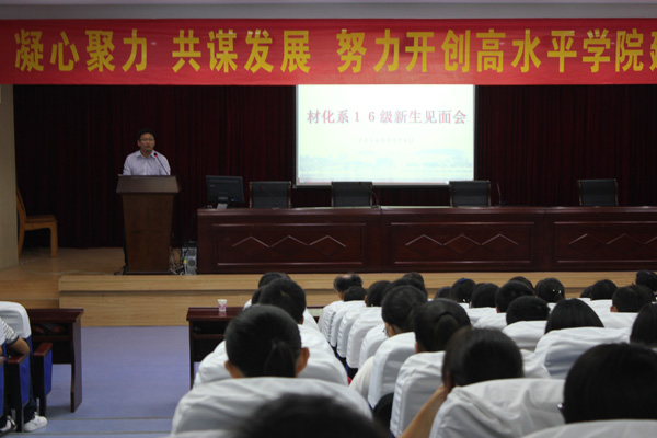 的悠久历史,并逐一介绍了材化系的各位老师,接着又通过详细的表格使同学们清晰地了解了材料化学系的人才培养方案以及专业课程计划。会议过程中全场掌声不断,充分表达了新同学对老师们的敬意。