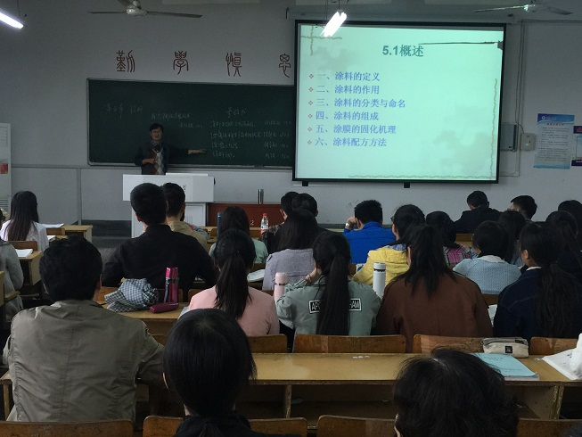 本次授课的主要内容是“涂料组成、作用以及其发展方向”,属于《精细化工》教材的第五章的内容知识。周运友在上课之前向同学们分享了几本与本节课相关的专业书籍,鼓励感兴趣的同学去校院图书室借阅学习。紧接着周运友通过生活中的常见实物入手,将同学们引入到了这堂课的主体内容,周运友结合身边的物品向同学们分析了当前涂料的发展状况、发展难题和该专业的发展前景;另外周运友充分利用同学们熟悉的涂料公司和工艺产品加以举例剖析,使得同学们在更进一步地了解到涂料的用途和种类等专业内容,同时也丰富了同学们的生活常识。在接近示范课尾声的时候,周运友告诉同学们涂料行业是一个很传统的行业,也是一个发展前景很大的行业,希望感兴趣的同学可以利用空闲时间多去图书馆了解一些相关的知识,鼓励同学们要学会举一反三,不断扩充自己的专业知识面。周运友在教学过程中,讲解案例丰富,节奏张弛有度,层层展开、循序渐进,条理清晰明白,充分体现出周运友丰富的教学经验以及其对课堂的良好掌控能力。周运友将板书和PPT结合使用,用风趣幽默语言为观摩的老师和同学们带来了一场别开生面的示范课。