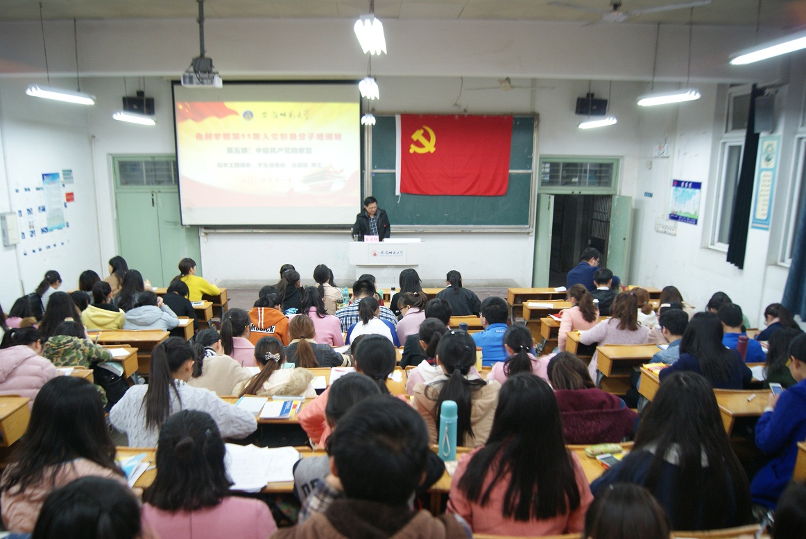 分党校在生化楼2033教室举行了学院第22期(总第54期)入党积极分子培训班第五讲课程:《中国共产党的宗旨》。校学生工作处处长、学工部部长台启权博士应邀主讲,学院全体入党积极分子参加了本次培训,培训会由班主任蒋建伟老师主持。