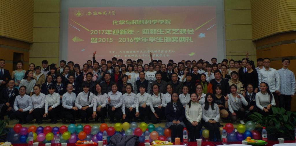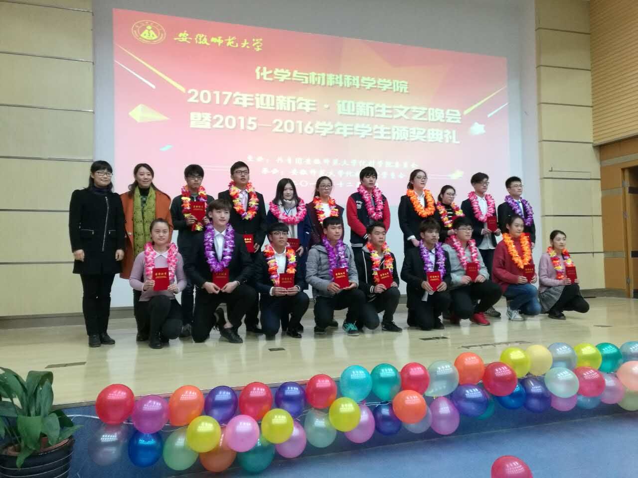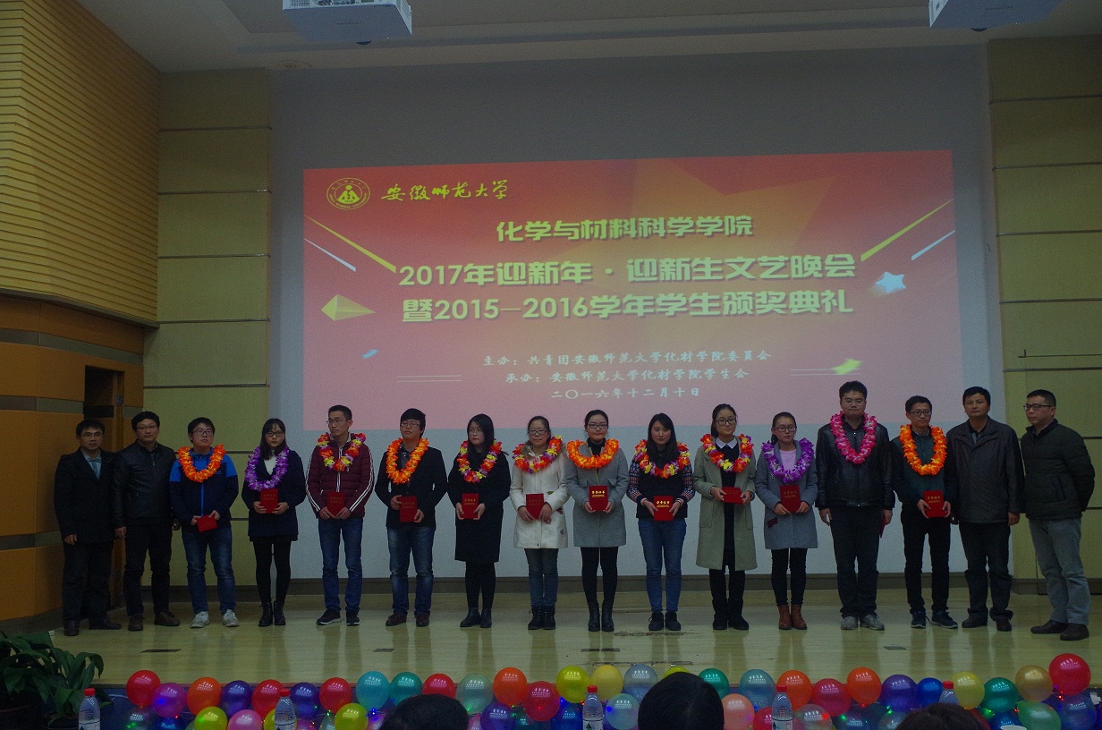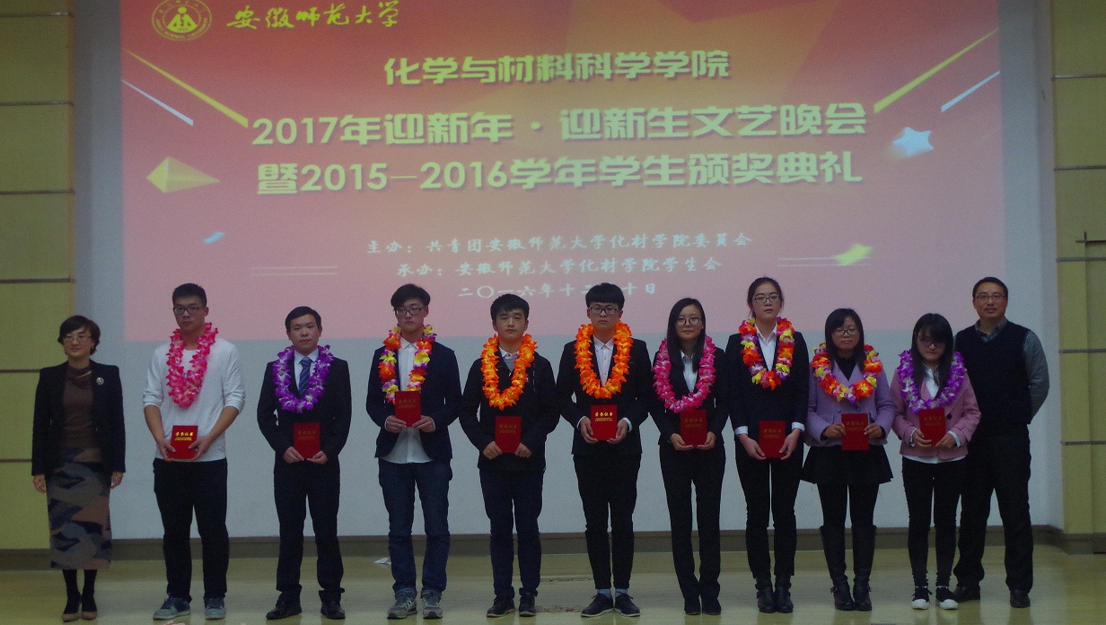 学院通过此次晚会对2015-2016年度先进个人和先进集体予以集中表彰。晚会隆重表彰了在学术创新、素质拓展和文体活动上取得显著成绩的“创新达人”和“素拓红人”,在学科发展、专业成长上取得显著成绩的“学科尖兵”和“专业牛人”奖项,还表彰了在社会实践、班级建设、学团建设等方面涌现出的先进集体和优秀团队。2013级材料化学一班班风过硬、学风优良,荣获安徽师范大学“十佳班集体”荣誉称号;2015级材料化学一班等班级、2014级化学师范一班等4个团支部被评为校级优秀团支部。