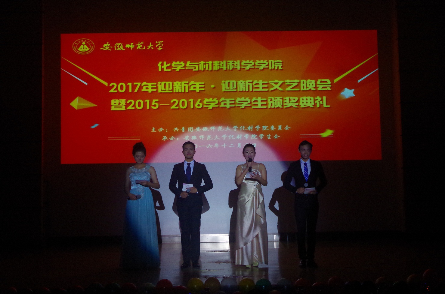 在赭山校区科技小礼堂隆重举办2017年迎新年·迎新生文艺晚会暨2015-2016学年学生颁奖典礼。校团委书记梁燕老师、校学生处副处长张玉新老师、卡通色情