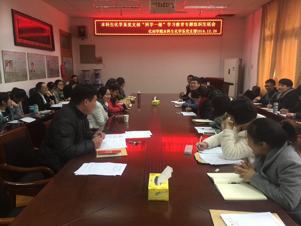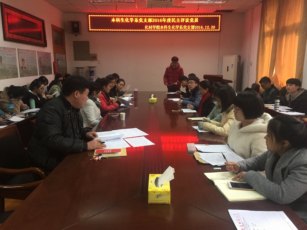 本科生化学系党支部在院大会议室召开了“两学一做”学习教育专题组织生活会以及党员民主评议会议。本次支部大会由化学系学生党支部书记蒋建伟老师主持,应到33人,实到29人,4名毕业班预备党员因在外工作原因正常履行请假手续。
