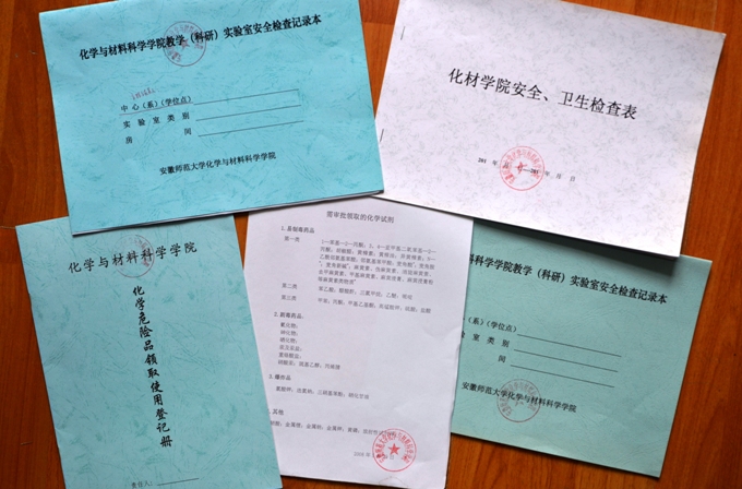 实验室安全检查制度》,给每个实验室发放了《实验室安全、卫生检查记录本》要求每个月每个实验室都要进行安全、卫生自查、相邻实验室互查,以及学院领导、专业负责人、学位点负责人抽查的三位一体检查机制,重大节假日以及开学初、学期末还进行专项检查。