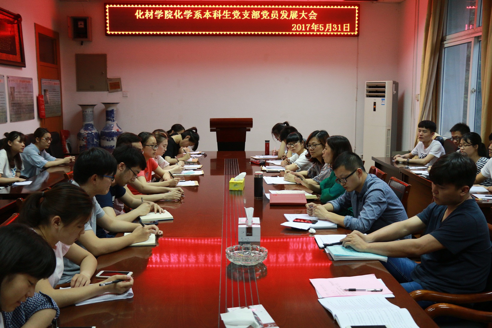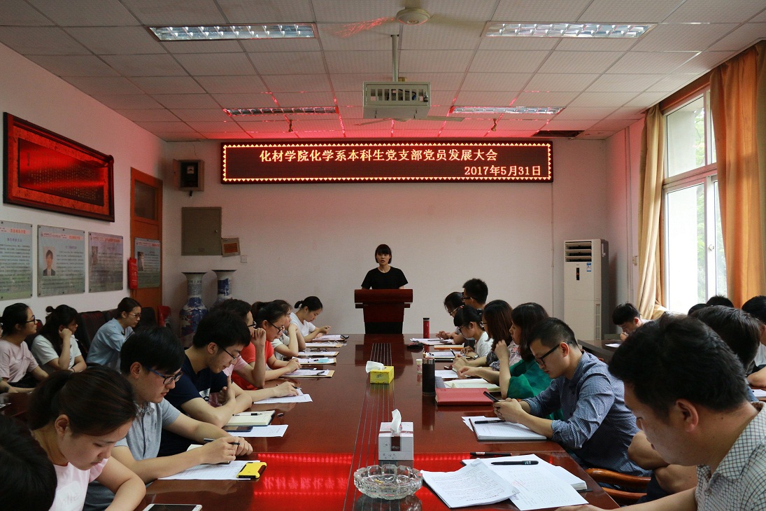 化学系本科生党支部召开预备党员发展大会。支部共有21名党员(含预备党员)、8名发展对象及其入党介绍人参加本次会议,校组织部党校办公室主任朱琳、学院党委副书记余妍霞列席本次会议。化学系本科生党支部书记蒋建伟主持会议。