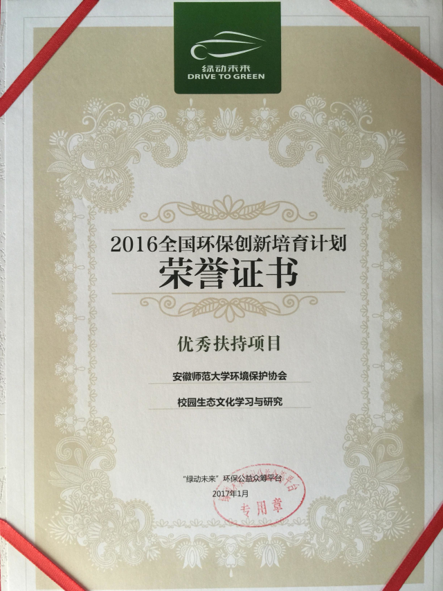 王国良 张君良)近日,由中国环境文化促进会联合上海通用汽车有限公司主办,“绿动未来”环保公益众筹平台承办,国内众多高校联合协办的“全国环保创新培育计划”正式公布结果,经过项目申请、网络展示投票、专家评审组评定等环节,我校环境保护协会“校园生态文化学习与研究”项目从全国200余项项目中脱颖而出,作为全国23项入选项目之一,荣获2016年全国环保创新培育计划环保公益创新类“优秀扶持项目”表彰。