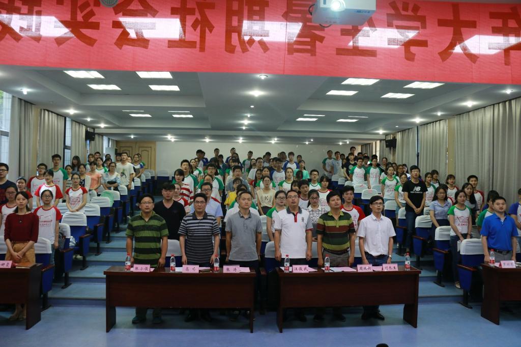 2017年大学生暑期“三下乡”社会实践活动启动仪式在赭山校区图书馆报告厅举行。校团委副书记刘长生,院党政领导班子,院社会实践思政理论指导教师张涛,化学系主任阚显文,化工系主任罗时忠,材化系主任王正华,院实践团队指导老师代表列席参会。校院班三级实践团队队员代表120余人参加了仪式,仪式由学院团委副书记蒋建伟主持。