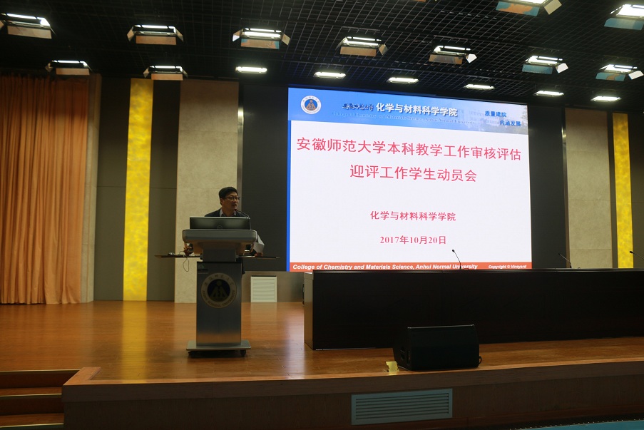 会议尹始,副院长张小俊用生动形象的语言对本科教学审核评估进行了背景介绍。他通过“什么是审核评估”、“审核评估的范围”、“审核评估的流程”和“审核评估的作用”四个方面向全体同学普及相关知识。张副院长强调,在专家进校考核环节中,专家将以学生的日常学习生活为切入点,围绕课堂、寝室、实验室等多个方面展开评估考核。考核方式包括了随机听课、召开座谈会、抽查寝室、检验专业技能等多方面、多角度的综合性考核方式。因此同学们在面对专家进校考核环节中一定要展现出师大人、化材人的精神风貌,端正态度,在学习与生活多个方面均要做到严于律己。