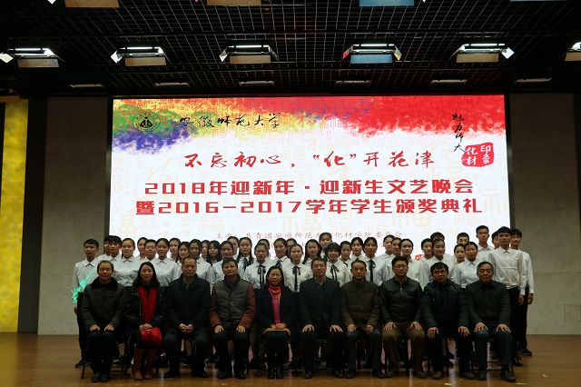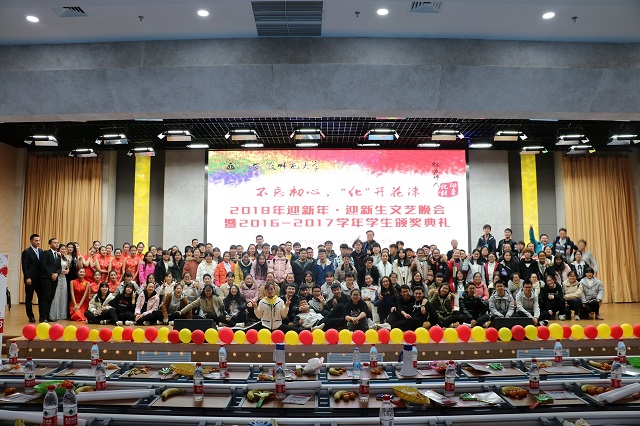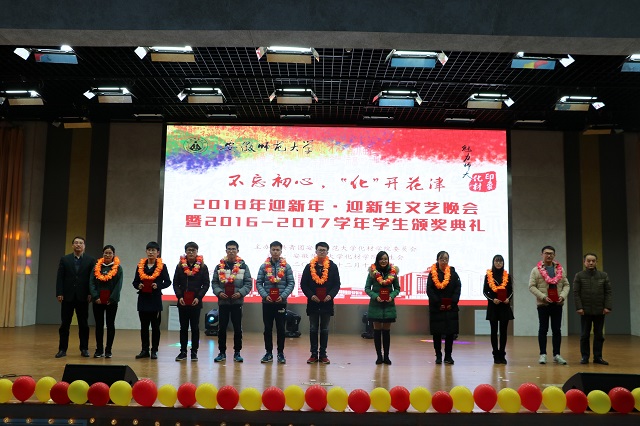 在理科大楼报告厅隆重举办“不忘初心,‘化’开花津”2016-2017学年学生颁奖典礼暨2018年迎新年迎新生文艺晚会。学院党政班子成员、教授委员会主任、各系负责人及全体辅导员老师与学院500多名同学共同观看了晚会。晚会分三个篇章进行。