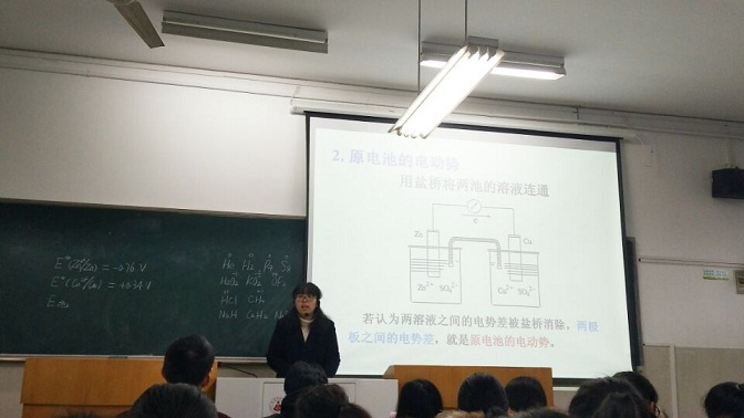 本次公开课的主要内容是第十章第一节的氧化还原反应和原电池。张莉老师引导着全班同学,共同回顾了酸碱解离平衡和沉淀解离平衡的相关知识,引出本节课的内容,同时,张老师要求同学们能在这一章的学习中,熟练运用化学热力学基础的知识,为学好本章内容奠定良好的基础。在课堂上,张老师娓娓而谈,列举了生活中的几个例子,带领大家遨游在氧化还原反应的知识海洋中,不仅回顾了中学时期学过的理论与概念,还学会用新的概念“氧化数”来解决氧化还原反应中的一些基本问题,学会用盐桥连接两个半电池反应,学会书写电池符号,并理解了本章重要的两个概念“电极电势”和“原电池的电动势”。大家在知识的学习中领略到氧化还原反应的重要性。