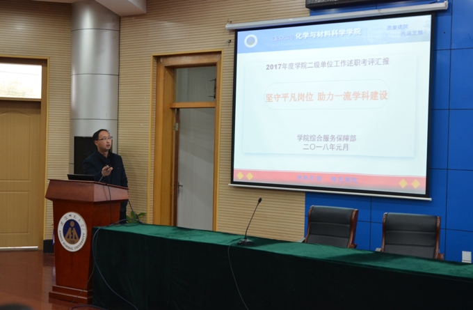 会议第二阶段,学院7个二级单位化学系、材料化学系、应用化学系、化学工程与工艺系、化学实验中心、综合保障服务部及皖江学院化学工程系主要负责人以PPT的形式对2017年的工作作了全面地汇报和展示。在汇报中各单位立足本职,通过一张张图片以及各类数据,交流经验,谋划发展。述职汇报结束后,由学院领导班子、教授委员会主任及各系主任、教师代表组成的评议小组以无记名打分的方式,对各二级单位的述职汇报进行了民主测评。