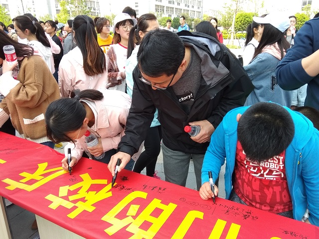 终点处,经过短暂的休整,参游师生纷纷在活动主题横幅上签名,为母校90岁生日献上了诚挚的祝福。随后,学院在现场组织了“校史校情我知道”的游园休憩会,主持人现场提问校史校情、专业相关问题,供参与者抢答,观众踊跃答题,几名小朋友的参与更是不时引发现场阵阵欢笑,广场上洋溢着青春、欢乐的氛围。