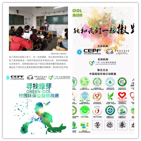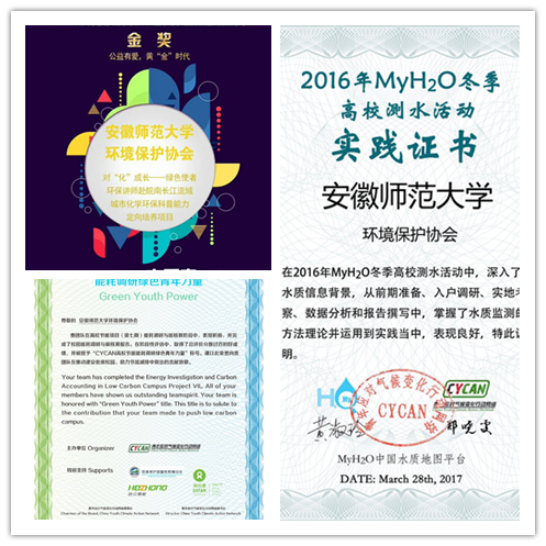 同时,协会也积极主持参与社会各类环保项目。2011年,“保护母亲河—全国青少年生态环保社团小额资助美涂士”项目被评为全国一类环保公益项目;2017年,在“CYCAN高校节能7.0校园低碳”项目中获得了全国第四名,且荣获“能耗调研优秀团队”荣誉(全国十佳优秀调研团队)与“能耗调研绿色青年力量”称号;同年成功结项了“CYCAN‘MyH2O’中国水质地图平台”项目;4月又荣获中国扶贫基金会和中石油公司“益路同行”公益社团年度项目资助资格。协会的工作也得到了国家基金会的支持和肯定,2017年4月,协会作为全国30支社团之一入选了中华环保基金会和中国扶贫基金会首批全国高校环保行动联盟,同时入选其 “GREEN IDOL”校园环保公益挑战赛联合发起方。同年12月,协会对“化”成长——绿色使者环保讲师赴皖南长江流域城市化学环保科普能力定向培养项目获2017年“阿克苏诺贝尔中国大学生社会公益奖”金奖。