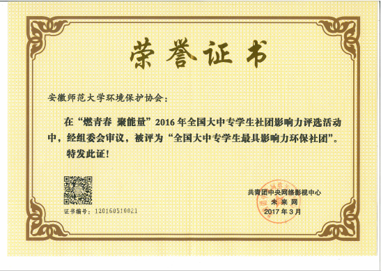 协会的“绿色唱响”趣味环保歌曲大赛获得了校第十二届社团文化节“精品活动”称号;“绿色使者”系列活动获得校“十佳事迹”荣誉;2014年协会在由香港环境保护协会并联合全国两百多所高校共同主办的“水果贺卡”活动中获得“全国优秀组织奖”;协会连续多年被评为校“十佳社团”;2017年5月,协会荣获安徽师范大学“我心目中的阳光社团”年度评选赭山校区第二名;“校园生态文化学习与研究”荣获上海通用汽车“绿动未来”全国环保创新培育计划环保公益类“优秀扶持项目”。