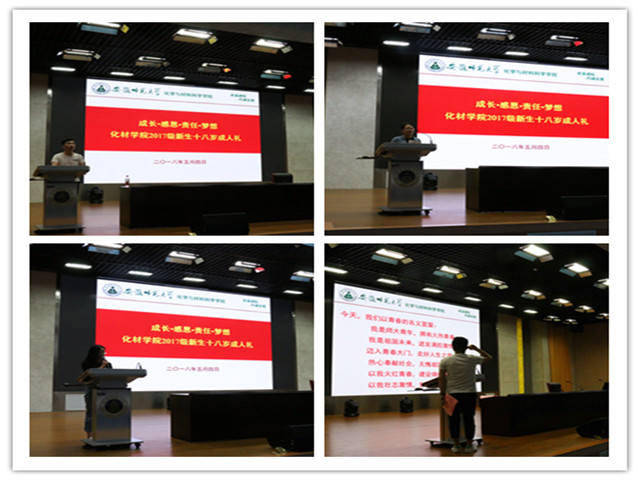 举行青春典礼,用典礼激扬青春梦想。成人礼仪式活动结束后,活动的主会场转移至理科大楼报告厅,以“感恩·成长·责任·梦想”为主题的成人礼典礼随即拉开序幕,典礼由17级辅导员王雨兵老师主持。典礼的第一项“我们的青春成长——青春自鉴视频”,视频中的每一个“小花菜”都多角度展示着她或他与众不同的大学生活,有闲暇时的游山玩水,有学生工作的日常,也有穿上西装走上讲台的成长,更有属于化材人的课堂与实验。随着视频的播放,同学们时而掌声雷动,时而安静聆听,时而凝重思考。以遴选的优秀学生代表青春视频为榜样,旨在引导更多的化材学子执笔青春,描绘更加精彩的大学生活,凸显典礼成长主题。典礼第二项“父母的叮咛期盼——家长亲笔家书”,在事先未告知学生的情况下,由学生代表父母亲笔家书,由17级三位辅导员代为念读。唯有意外,才有惊喜,师生都被父母对孩子深切的爱所感动着,大到人生规划,小到生活琐事,字里行间都充满着殷殷期盼与爱的芬芳,以家书的形式让同学们在青春成长的道路上感受爱意,学会感恩。典礼第三项“化材人的时代强音——青年团歌宣誓”,他们不仅是父母的希望,更是祖国的未来,是新时代的青年团员。随着团歌响起,全体师生起立,以化材人的时代最强音唱响共青团之歌,为青春呐喊助威。随后进行成人礼宣誓,同学们一字一句,铿锵有力,以自我宣誓的方式感受成长,学会担当。
