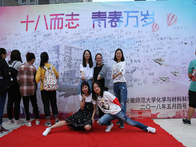 理科大楼样式的个性化书签,在书签背面印有学院领导、教师代表及辅导员青春寄语与美好祝愿。每一份独特的寄语书签送给独一无二的他们,同学们在书签盒旁欣喜期待,抽到的书签是叮咛,是嘱托,也是年长者对年幼者未来的美好祝愿,愿他们走好青春之路,迈向美好未来。在红毯尽头是一块空白幕布,同学们走完红毯后纷纷在幕布上进行自我的青春署名,庄重的签上名字是自我青春的呐喊,是自我青春的宣誓,也是自我青春的担当。此外,学院还精心准备了印有化学元素的人形立拍、青春主题的拍照框供同学们仪式后拍照留念,同学们三五结伴进行拍照合影,他们的青春色彩是一道靓丽的风景,镜头虽定格在这个属于他们的青春瞬间,但他们的青春之路必将比这红毯更加靓丽悠长。