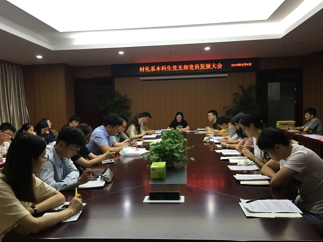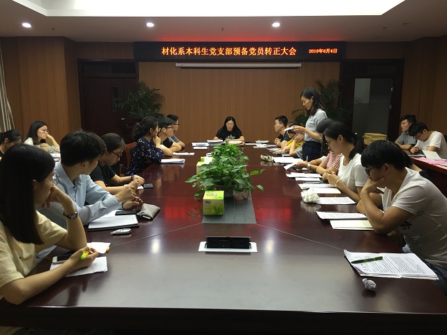 闫绍兵)6月4日晚,材化系本科生党支部预备党员接收大会及预备党员转正大会在学院702会议室召开。学院党委秘书汪丰云、学生入党介绍人蒋建伟、王国良、朱姗参加会议。学院部分入党积极分子观摩了本次会议,会议由材料化学系党支部书记陈露主持。