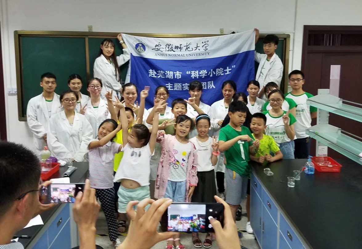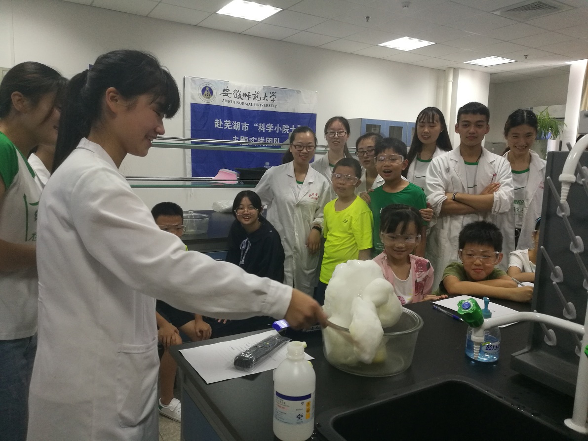 “科学小院士”实践团队全体队员于安徽师范大学花津校区化学楼开展了“科学小课堂之趣味实验”活动。